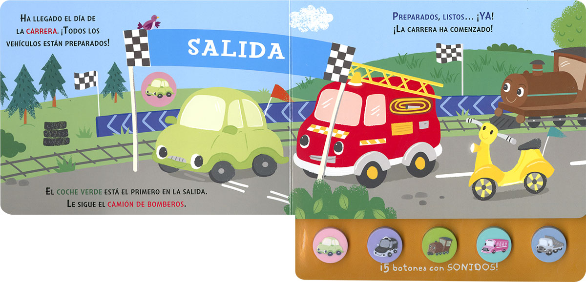 Cuál de los vehículos ganará este año la carrera? Con este libro será como si estuvieses allí mismo, pues apretando los botones los escucharás. ¿No son divertidos? Coloridas ilustraciones, sonidos, botones de silicona, páginas de cartón... ¡Un libro ideal para los pequeños de la casa!