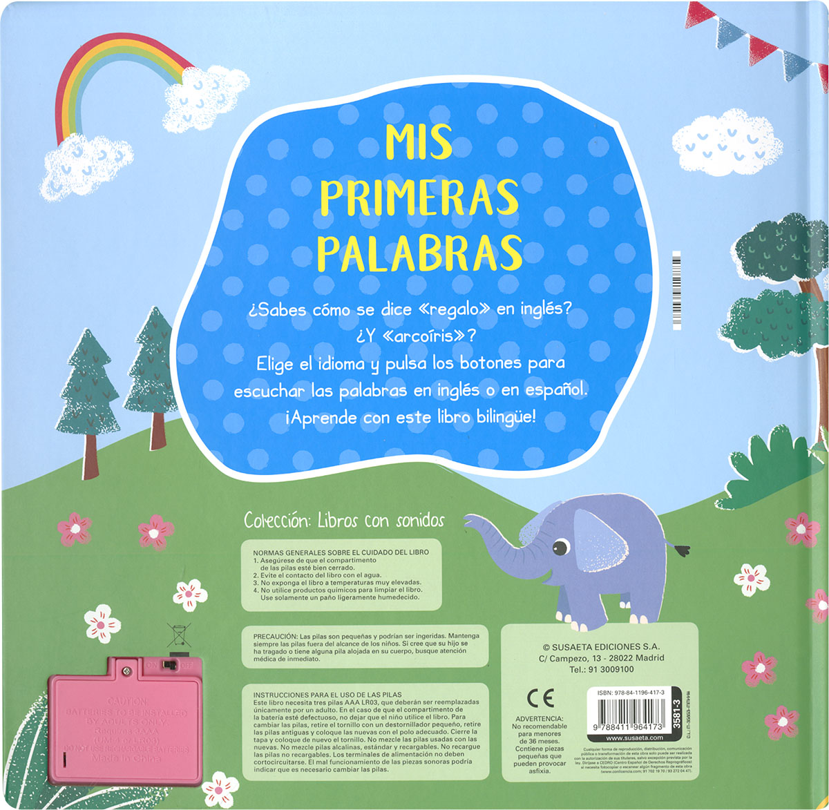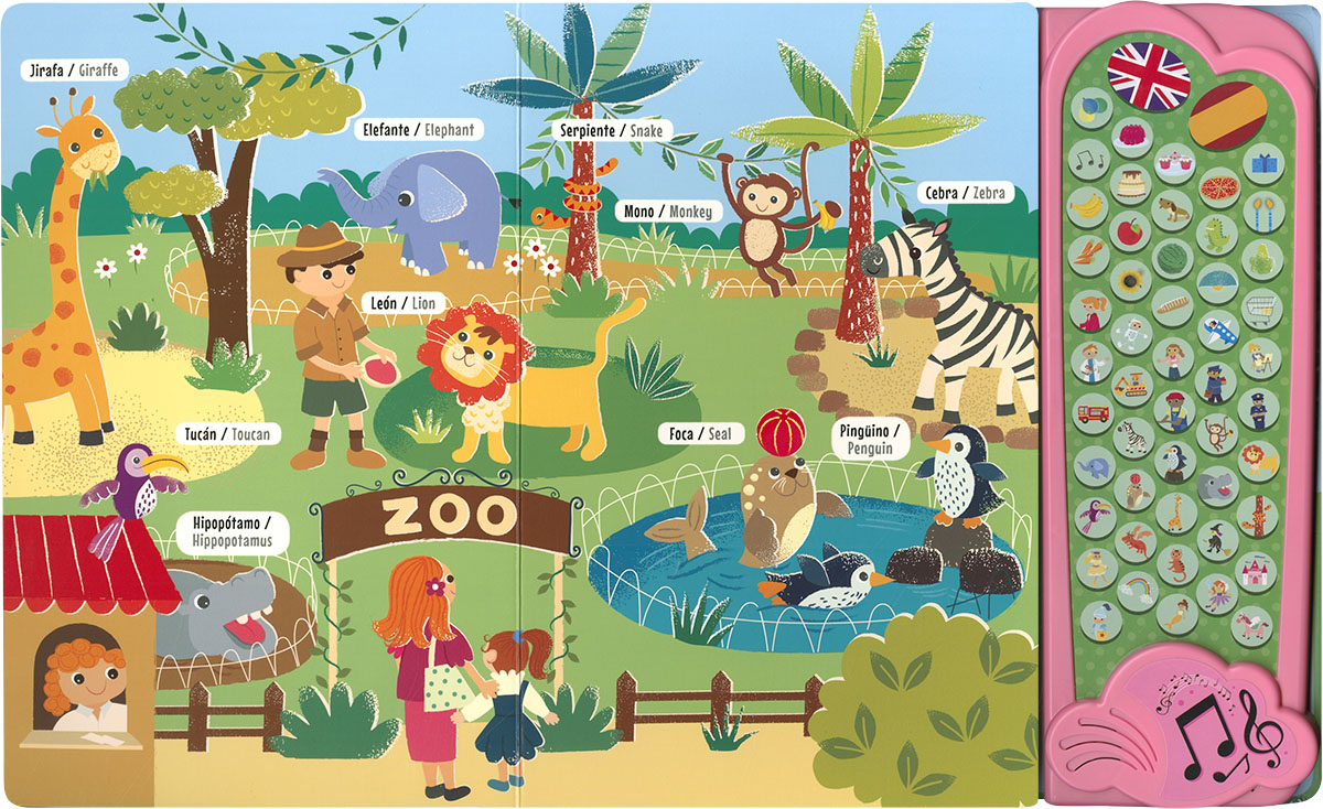 La infancia es el mejor momento para aprender una segunda lengua o para integrar el bilingüismo. En este libro, los objetos representados en las escenas están etiquetados, y, pulsando el botón correspondiente, podrás escuchar su pronunciación tanto en español como en inglés. ¡Prueba a decir las palabras antes de pulsar los botones! Páginas de cartón y 50 sonidos de palabras para aprender y jugar con este libro ideal para la edad temprana.