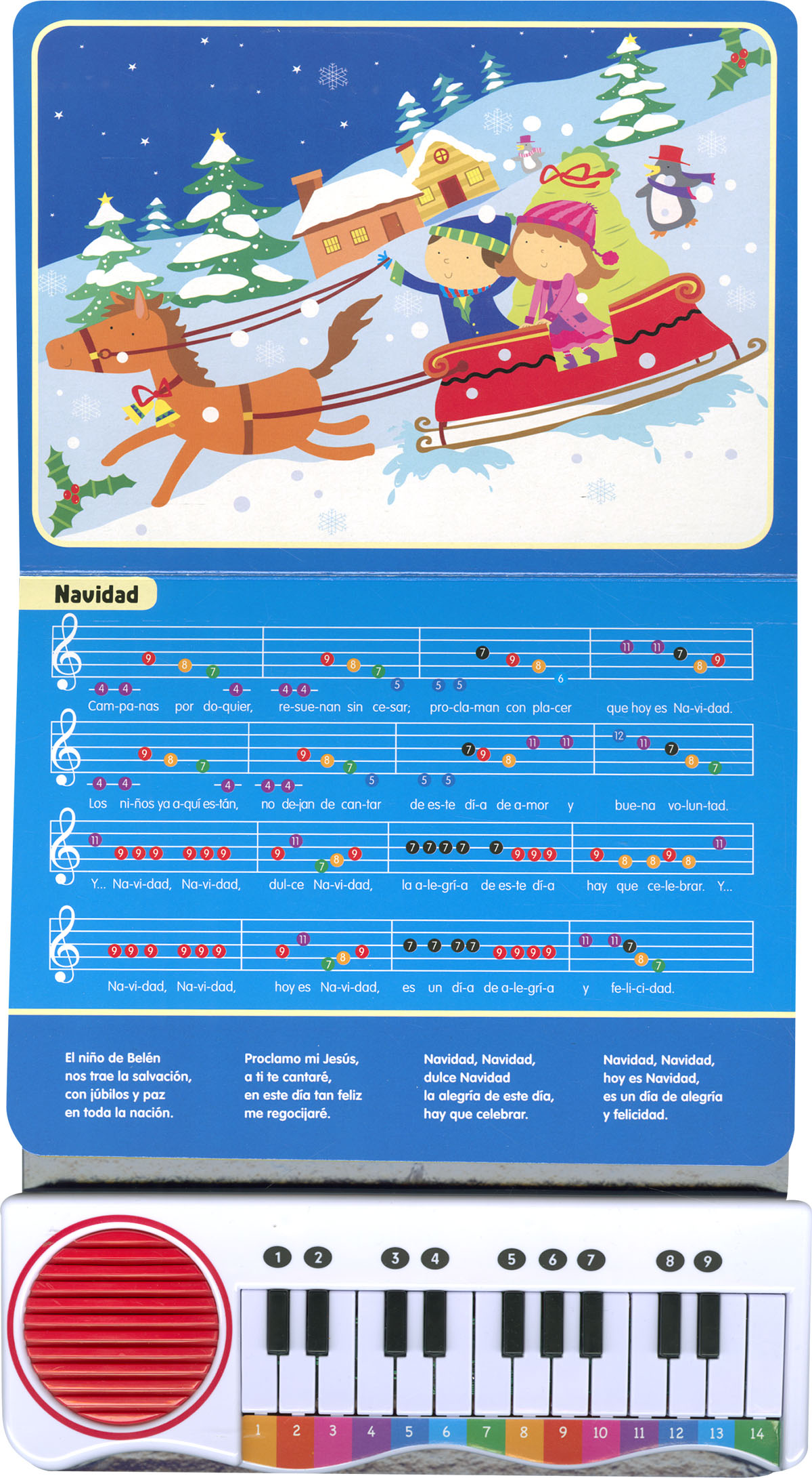 Encuadernación:  Tapa dura con acabado en brillo y estampación dorada. Páginas de cartón y teclado con sonido.