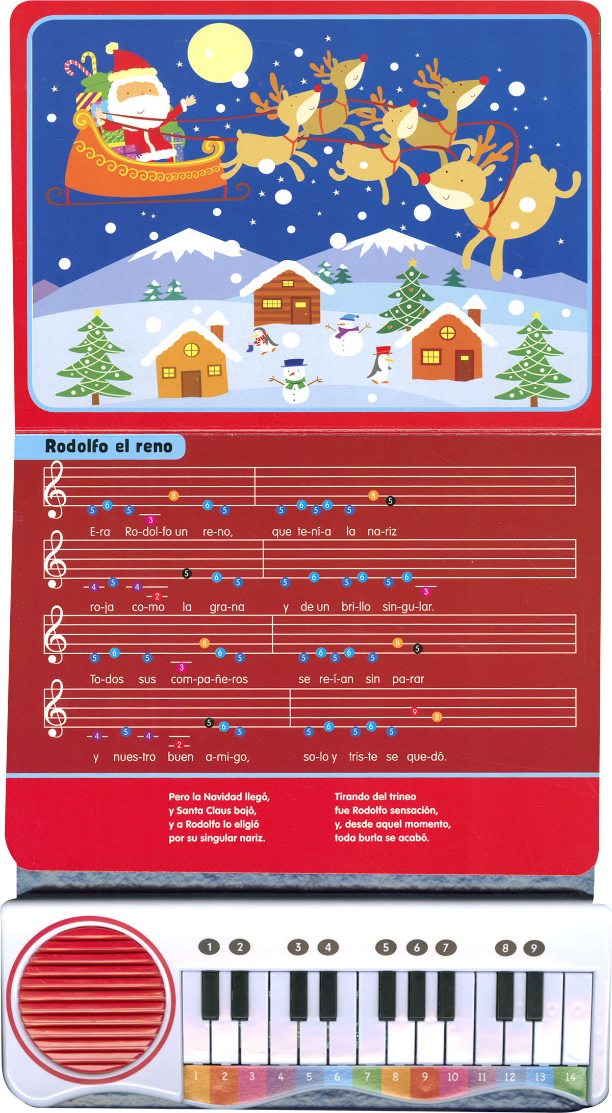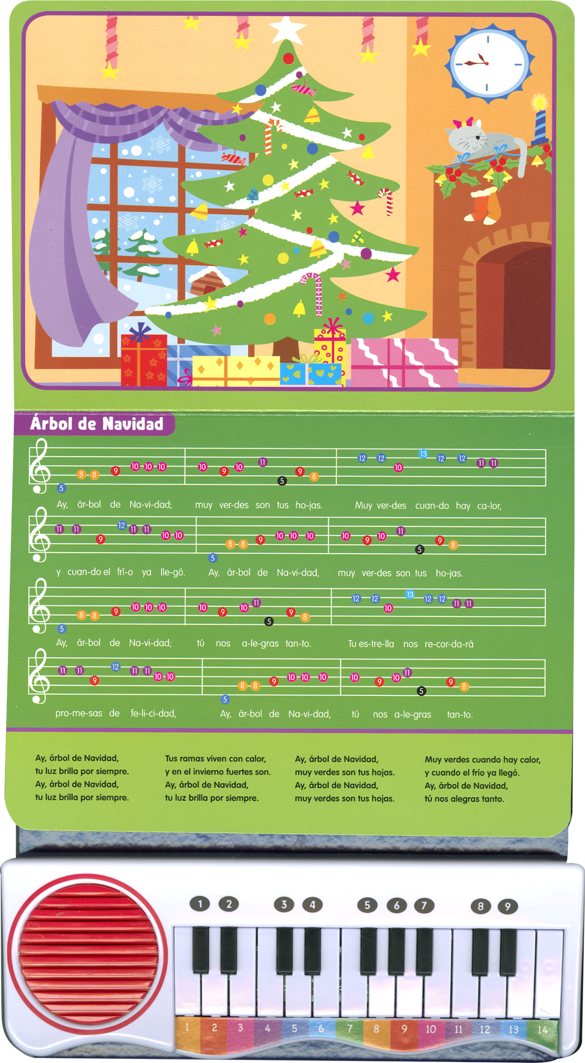 Disfruta de la Navidad tocando tú mismo los villancicos con este libro piano para niños. Las partituras secillas tienen notas de colores adaptadas para poder seguirlas sin necesidad de saber solfeo, y el teclado de tamaño reducido permite a los deditos más pequeños tocar las teclas y hacer sonar las melodías. Una preciosa y divertida iniciación a la música para disfrutar en Navidad y el resto del año.