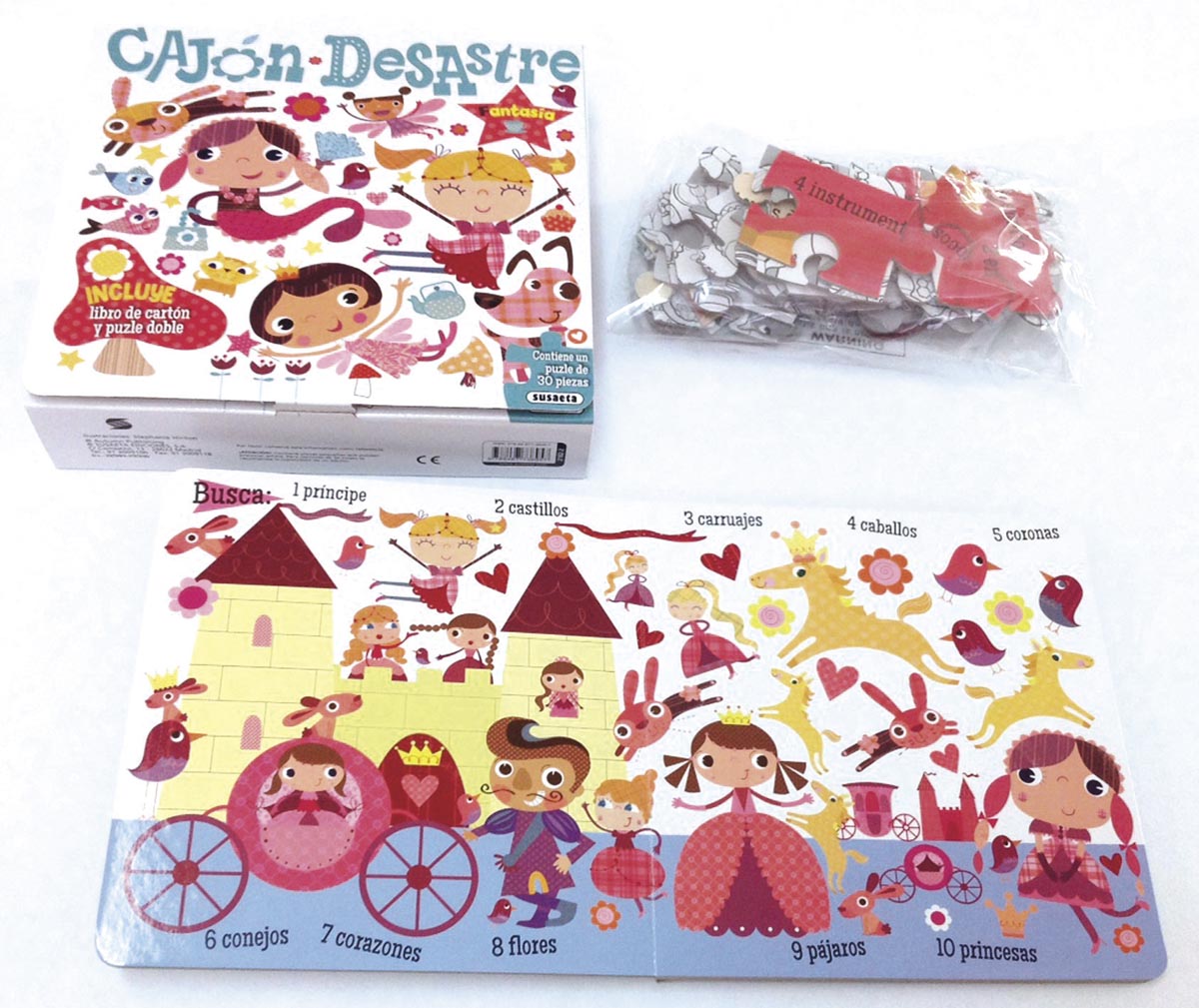 Encuadernación:  Caja de cartón plastif. con asa, cont.: 1 libro de cartón y 1 puzle doble 30 pzas. p/colorear 1 cara