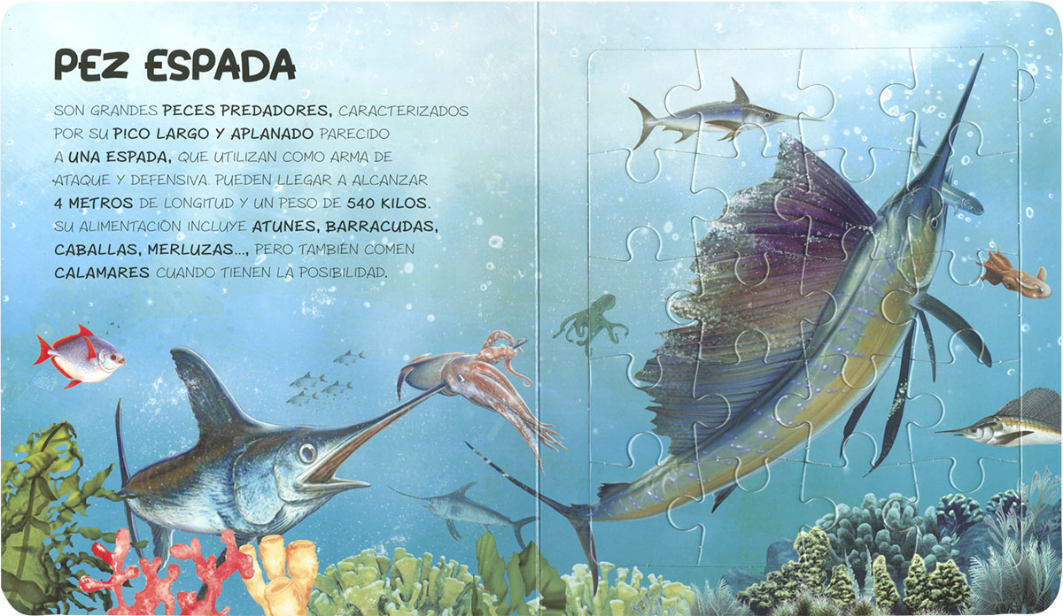 Descubre algunos de los animales más fascinantes que viven en los mares y océanos de nuestro planeta: tiburones, ballenas, calamares... Aprende con este libro muchas curiosidades sobre todos ellos y juega con los puzles que encontrarás en sus páginas.