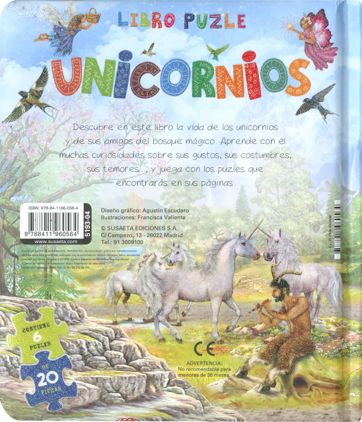 Encuadernación:  Cartoné con cubierta plastificada y purpurina hojas de cartón con 6 puzles de 20 piezas