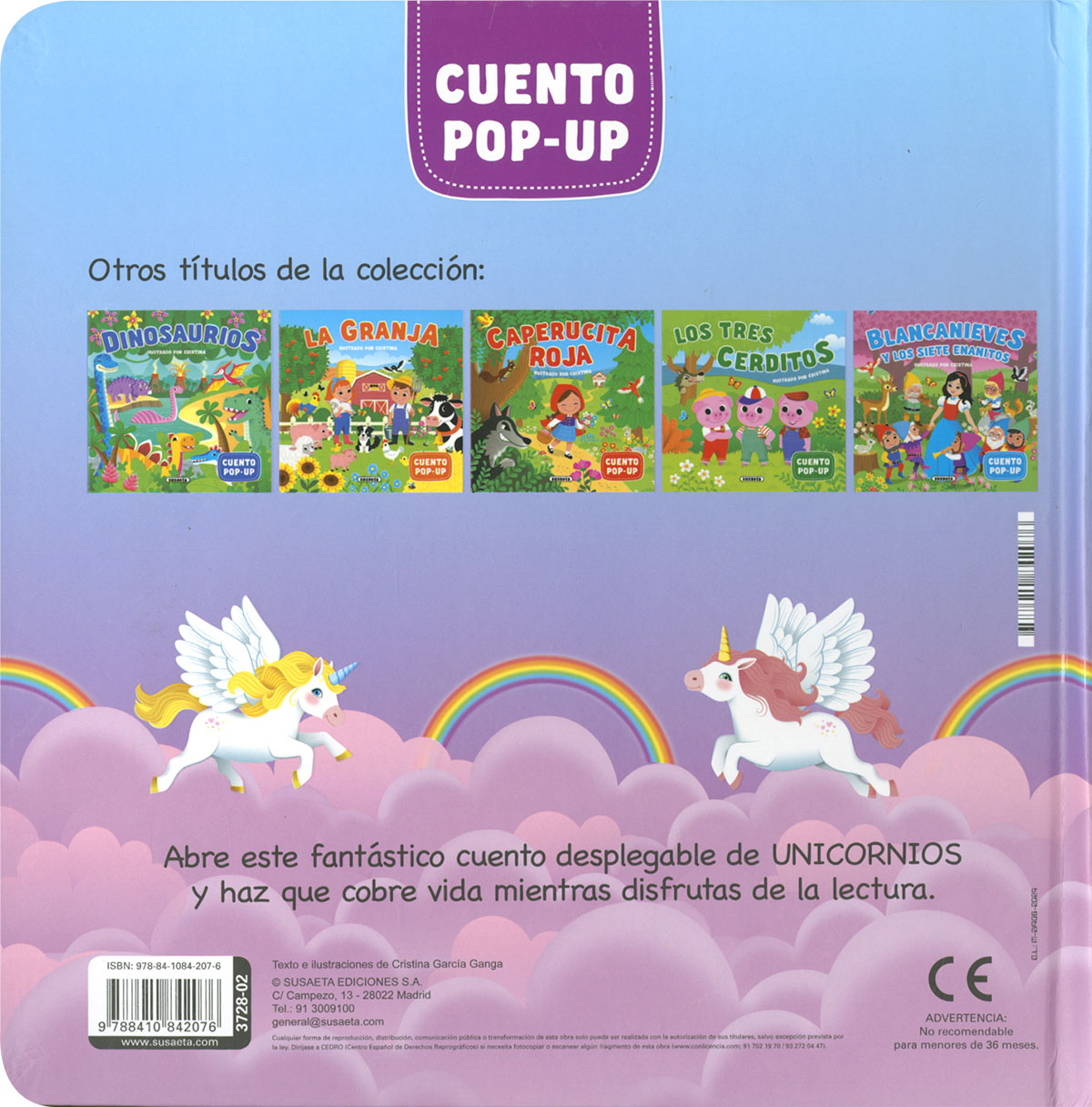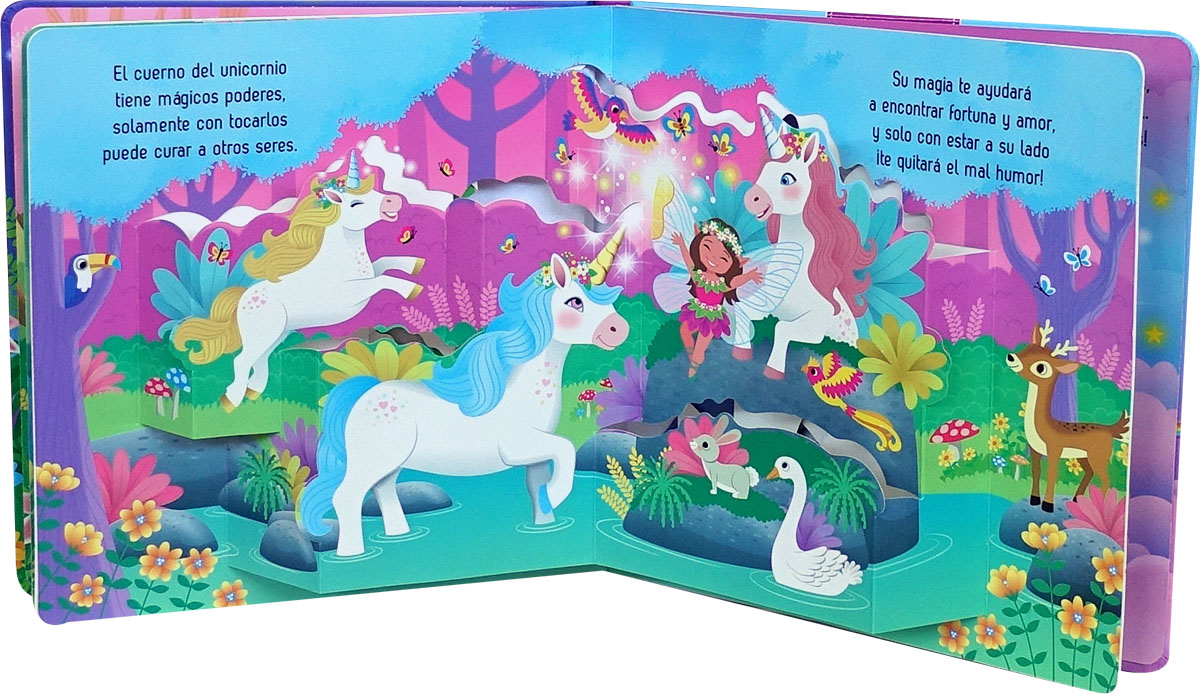 Abre este fantástico cuento desplegable de UNICORNIOS, lleno de simpáticas ilustraciones a todo color, y haz que cobre vida mientras disfrutas de la lectura.