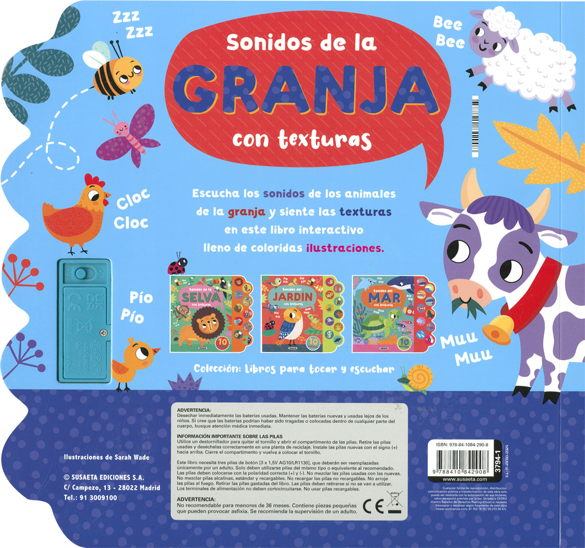 Encuadernación:  Libro de cartón plastificado en brillo, con módulo de sonido y texturas en interior y exterior.