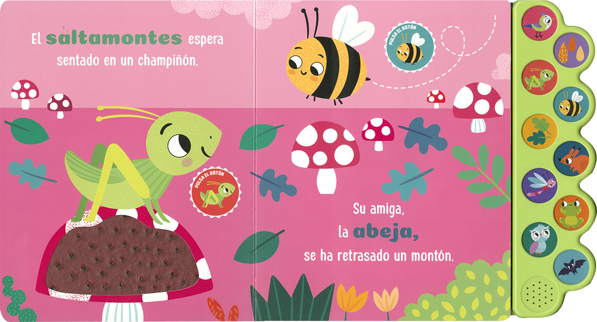 Oyes al pájaro? ¿Y a la abejita? ¡Pulsa el botón y escúchalos! Descubre el sonido que hacen los animales de tu jardín y siente las texturas con este libro interactivo ilustrado. Con 10 sonidos y 6 texturas, este libro infantil de cartón será tu favorito.