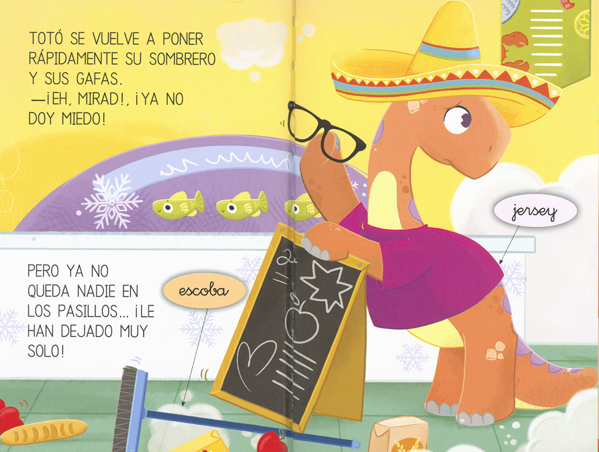 Totó es un diplodocus un poco travieso y hoy ha decidido meterse en el súper de los humanos. Para no asustarlos, se disfraza con un jersey, un sombrero y unas gafas. Sin embargo, surge un problema y termina espantando a todo el mundo. Diviértete con Totó en el súper y descubre cómo acaba su aventura.