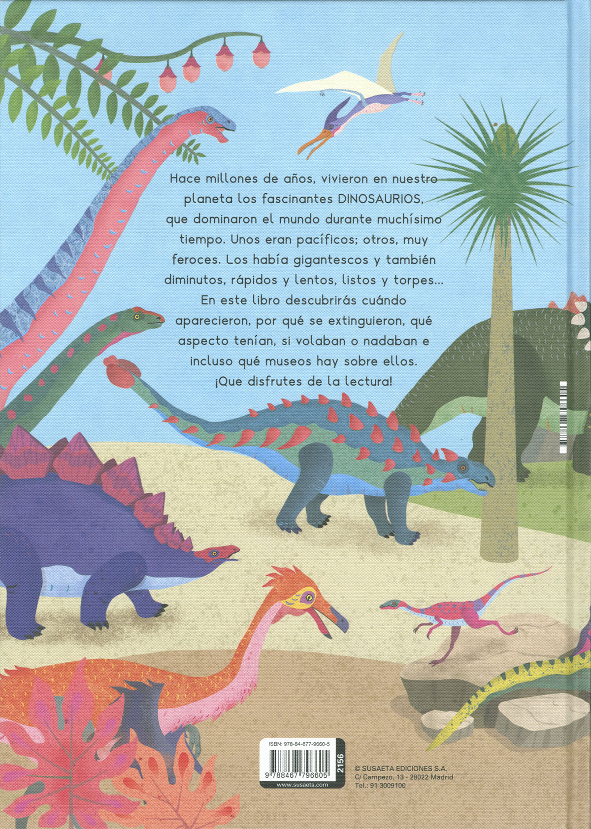 Hace millones de años, vivieron en nuestro planeta los fascinantes dinosaurios, que dominaron el mundo durante muchísimo tiempo. Unos eran pacíficos; otros, muy feroces. Los había gigantescos y también diminutos, rápidos y lentos, listos y torpes... En este libro, descubrirás cuándo aparecieron, por qué se extinguieron, qué aspecto tenían, si volaban o nadaban, e incluso qué museos hay sobre ellos. Un gran libro para que disfrutes de los dinosaurios y de la lectura.