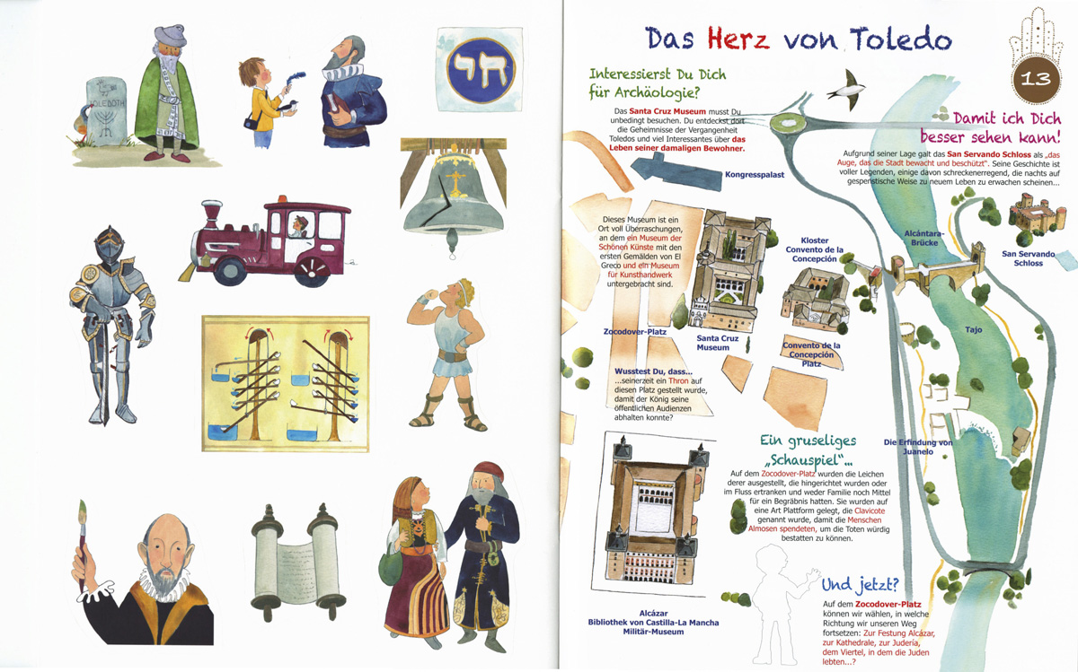 Die Straßen einer Stadt sind voller Geschichte, Kuriositäten und alten Legenden. Welche Geheimnisse verstecken sich hinter den Fassaden der alten Gebäude? Woher kommen die örtlichen Feste und Traditionen? Welche Geschichte haben die emblematischen Bauwerke und die offiziellen Symbole? Entdecke alles, was Du über Toledo wissen musst, mit diesem lustigen Reiseführer. Damit die jungen Besucher beim Kennenlernen dieser interessanten Stadt Spaß haben. Außerdem findest Du hier viele spannende Vorschläge, um Dich zusammen mit Deiner Familie zu vergnügen und Deine Reise richtig zu genießen!