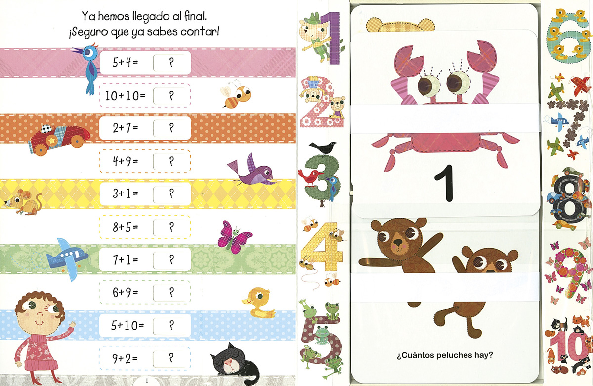 Sabes cuánto suman 2+8? ¿Y 3+2? ¡Tira de la lengüeta y comprueba las soluciones a las sumas! ¿Has acertado? También puedes aprender a contar con las tarjetas ilustradas, que, además, te enseñarán a escribir los números. ¡Practicar con los números en muy divertido!