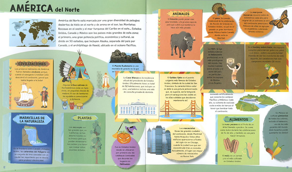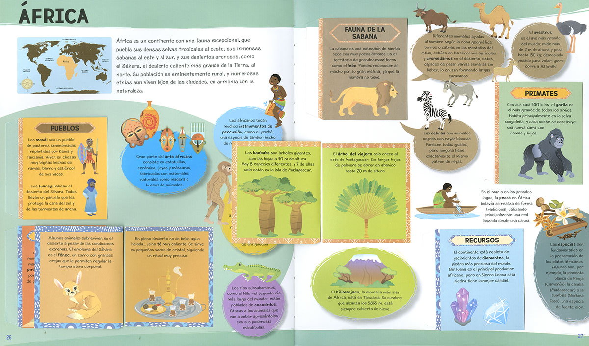 Explora el planeta continente por continente: los paisajes más impresionantes, los animales, los monumentos, los diferentes pueblos y sus costumbres, las banderas, la vegetación... LDebajo de cada solapa encontrarás información adicional para que conozcas el mundo en el que vivimos y que todos compartimos.