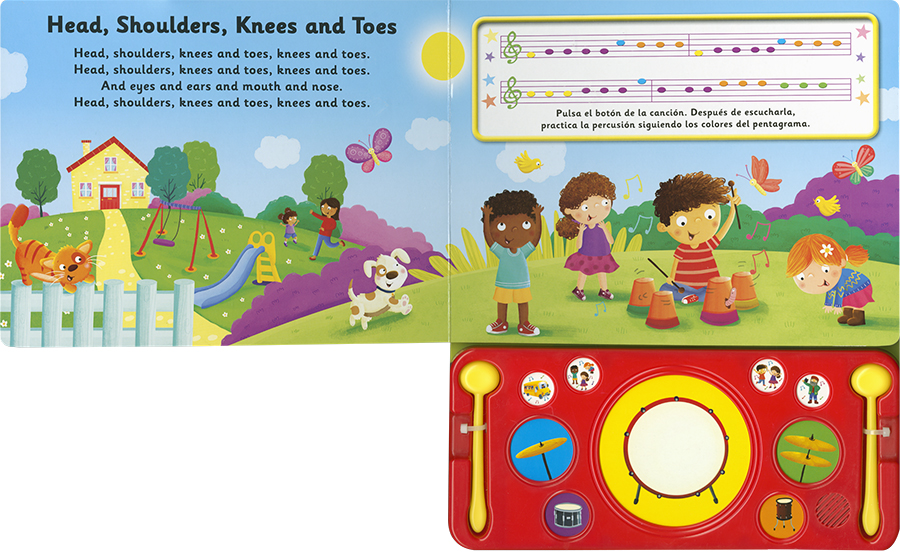 Encuadernación:  Cartón plastificado brillo y troquelado, con tambor musical y pulsadores con canciones en inglés