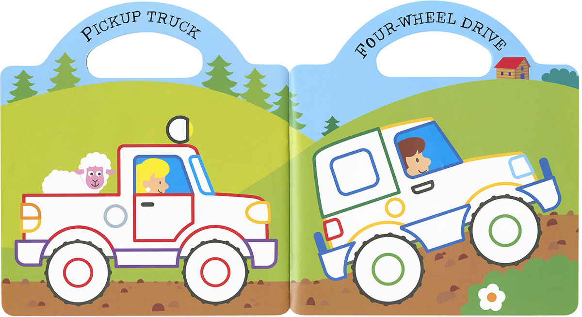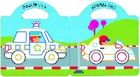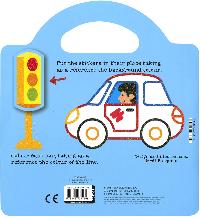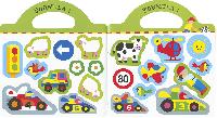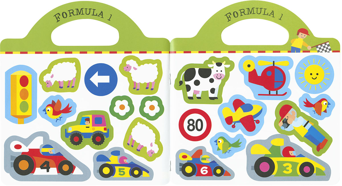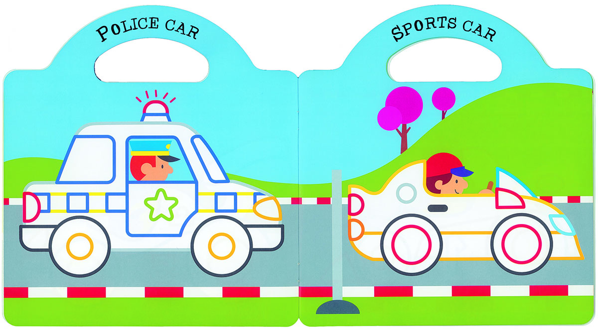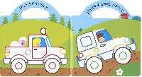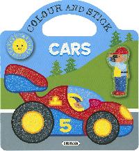 Put the stickers in their place taking as a reference the background colour. Colour each car, taking as a reference the colour of the line.