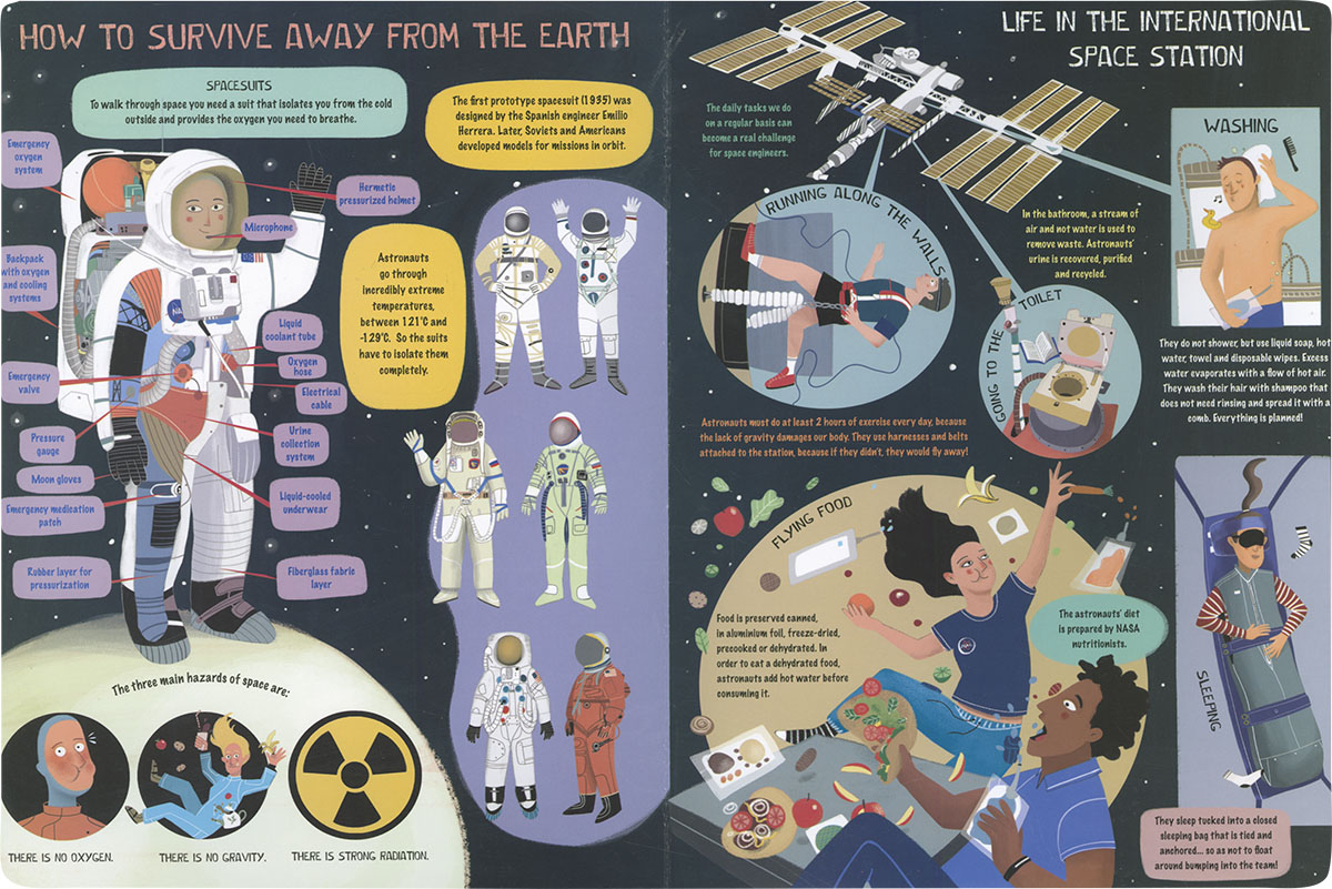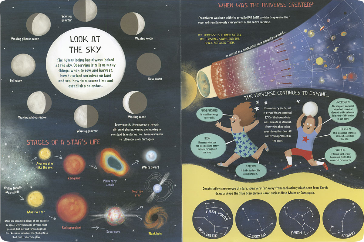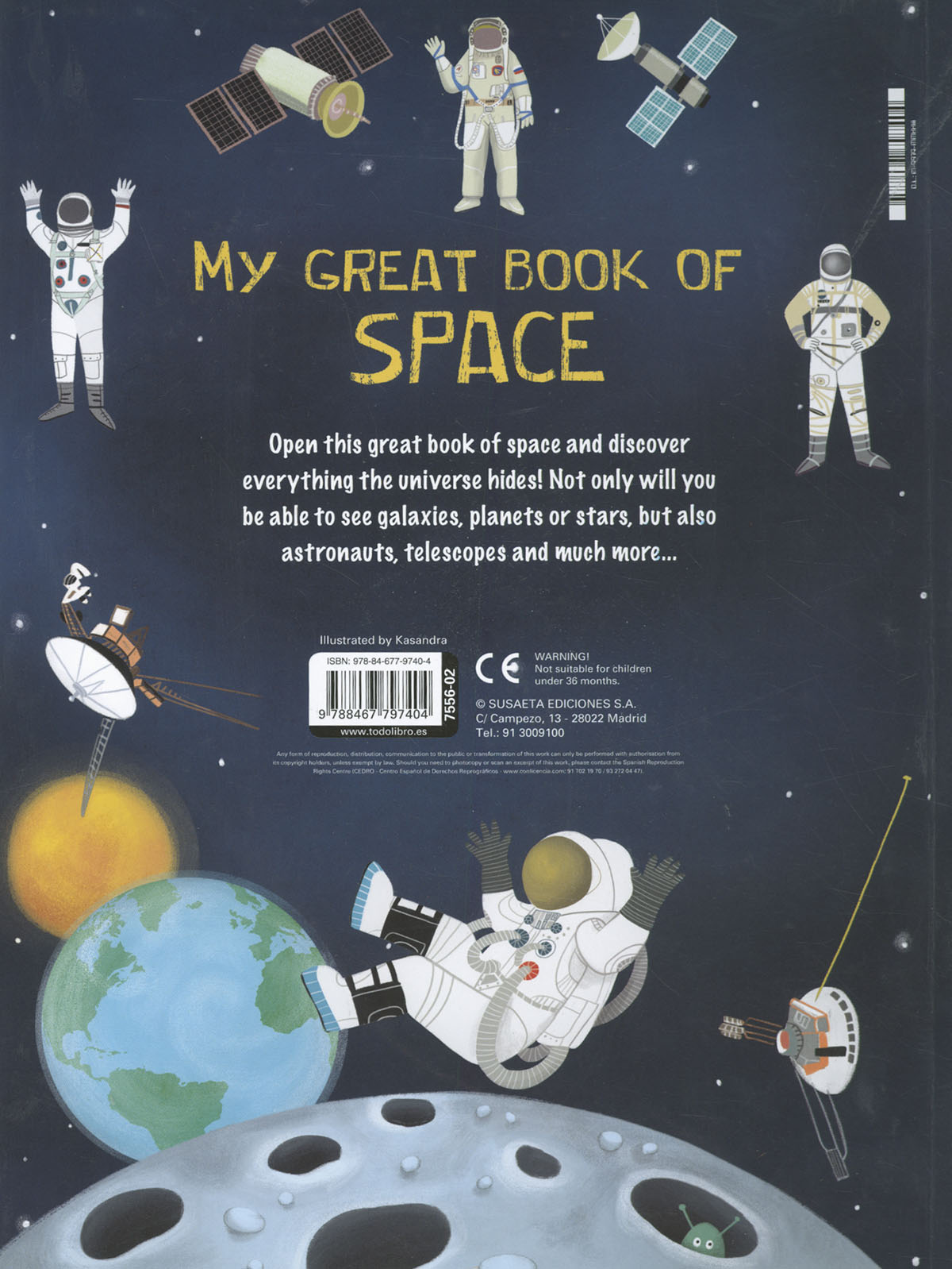 Open this great book of space and discover everything the universe hides! Not only will you be able to see galaxies, planets or stars, but also astronauts, telescopes and much more...