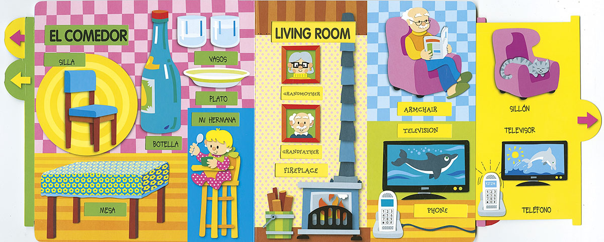 Una estupenda colección de libros interactivos para que los niños aprendan inglés de una forma divertida. Los adultos pueden leer con ellos las palabras en español de cada página, tirar de la flecha y ver la traducción en inglés. También pueden jugar juntos a memorizar las palabras y tirar de la flecha para ver quién ha acertado.
