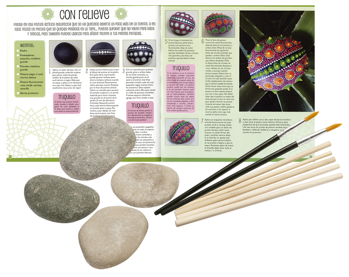Si te gusta la artesanía y quieres hacer cosas espectaculares, esta pintura flourescente te dejará de piedra. Con instrucciones paso a paso que indican cómo hacer cada modelo y el material necesario para llevarlo a cabo, el resultado de esta pintura en piedras queda fabuloso, ¡y te convertirá en todo un artista!