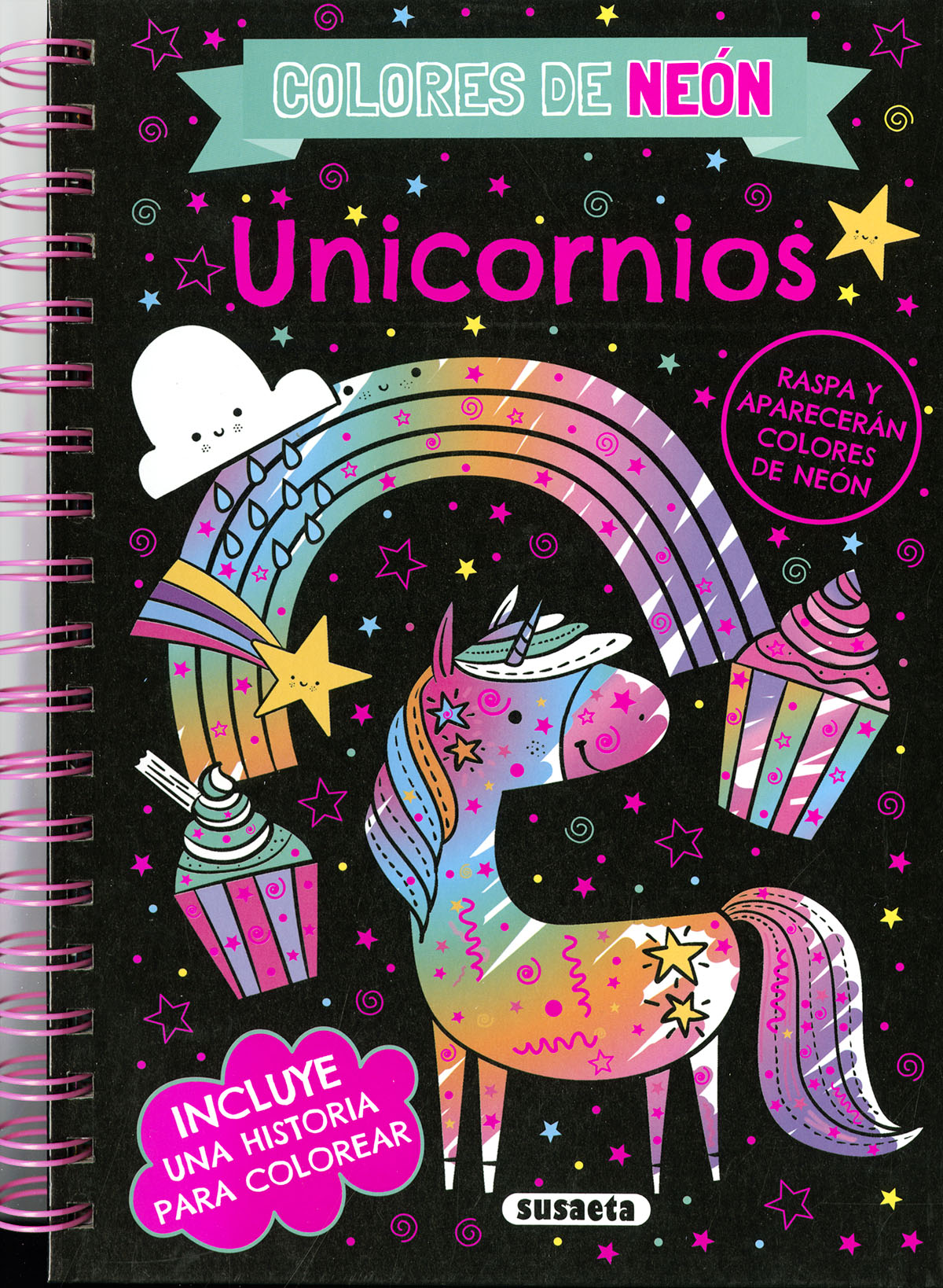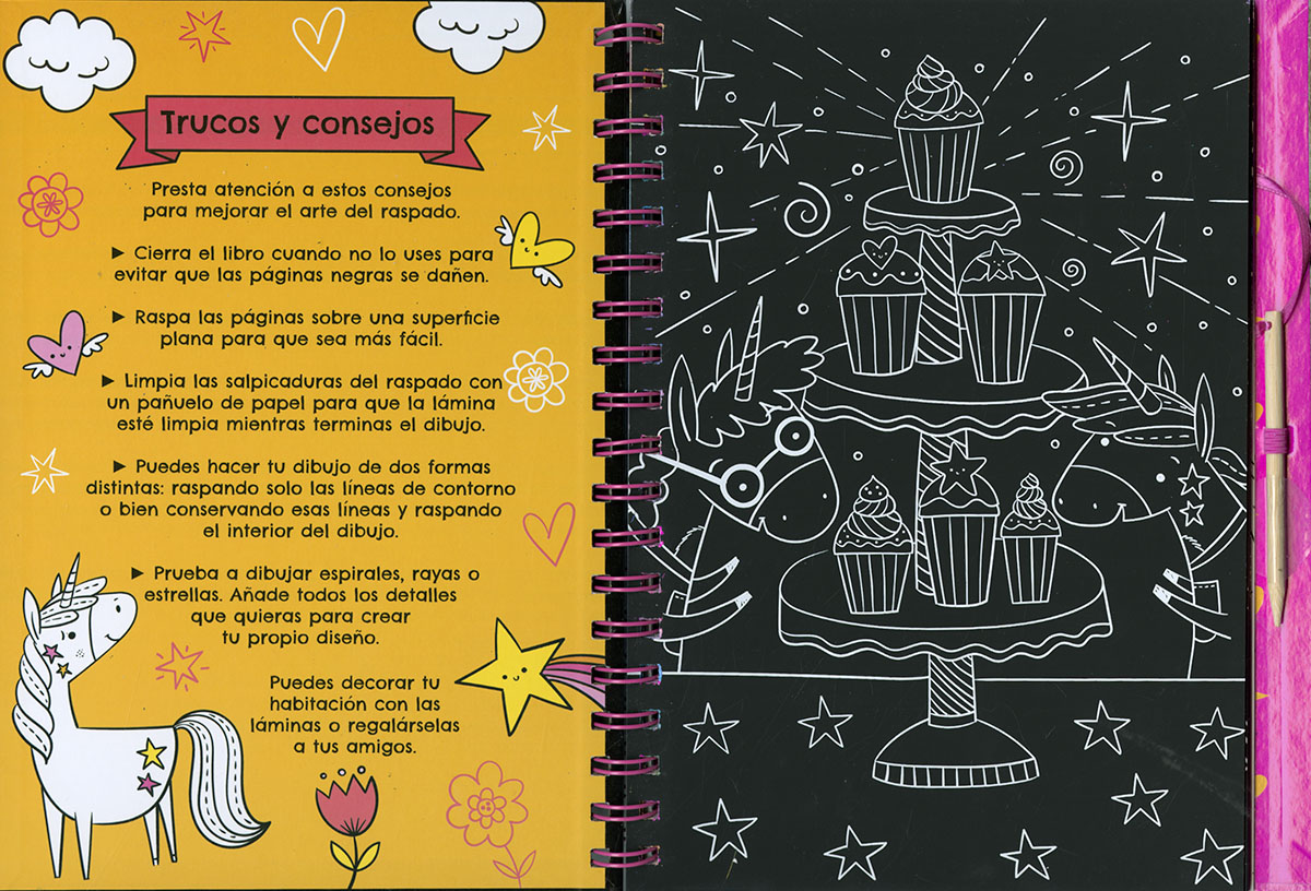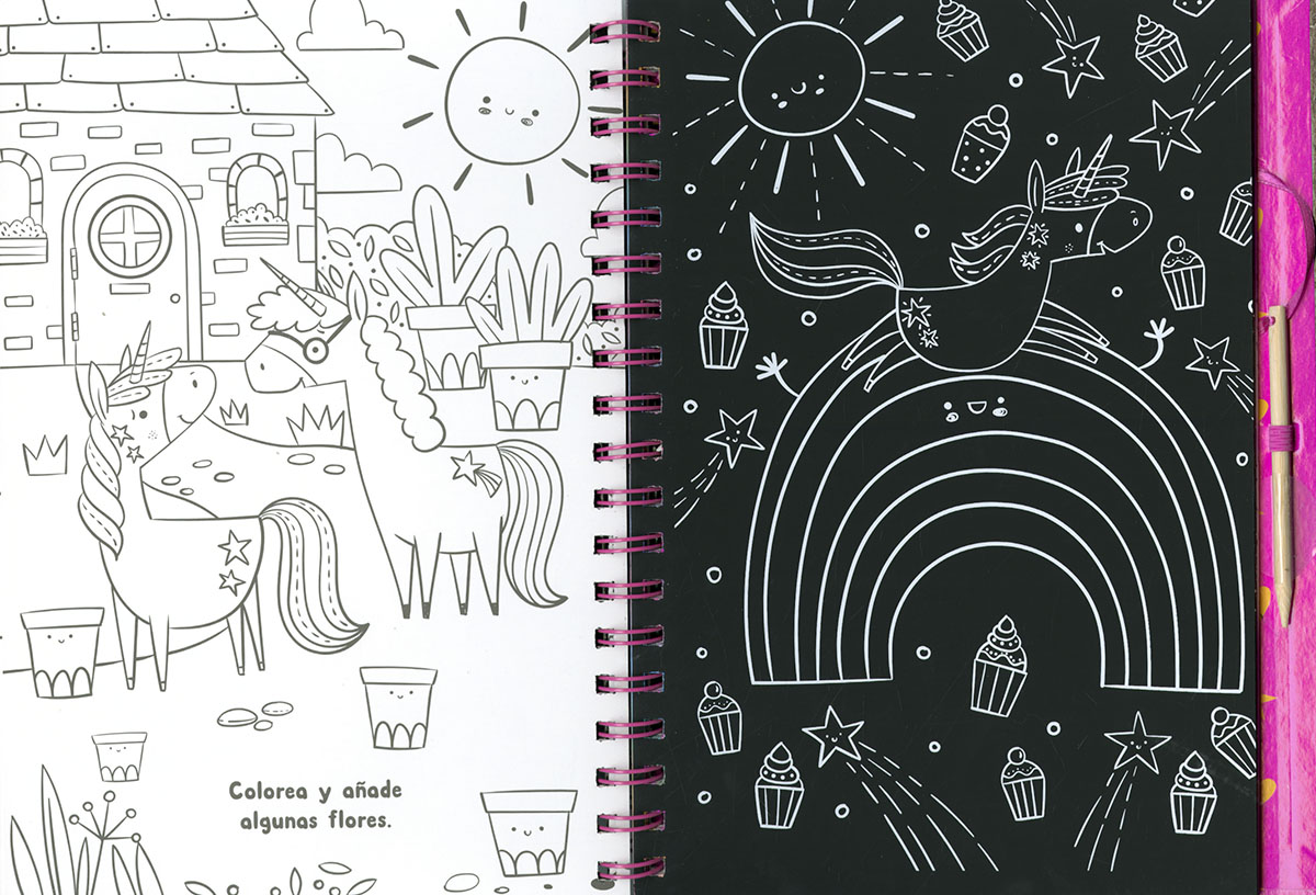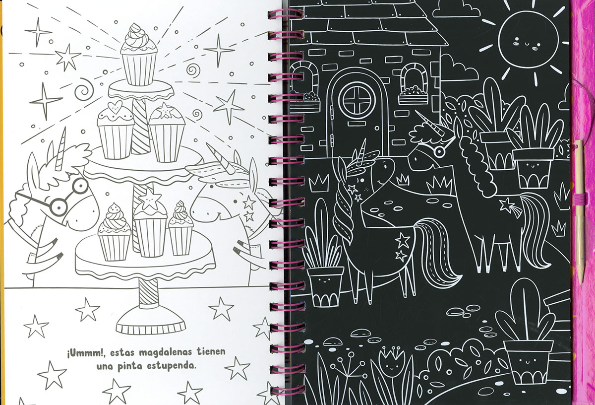 Coge el rascador de este libro y llena el mundo de los unicornios con los colores de neón. ¡Te sorprenderá el efecto!, y podrás también colorear la parte de atrás de las láminas. Además, podrás leer una historia y darle vida con tus propias pinturas o rotuladores. Un libro infantil para crear y divertirte.