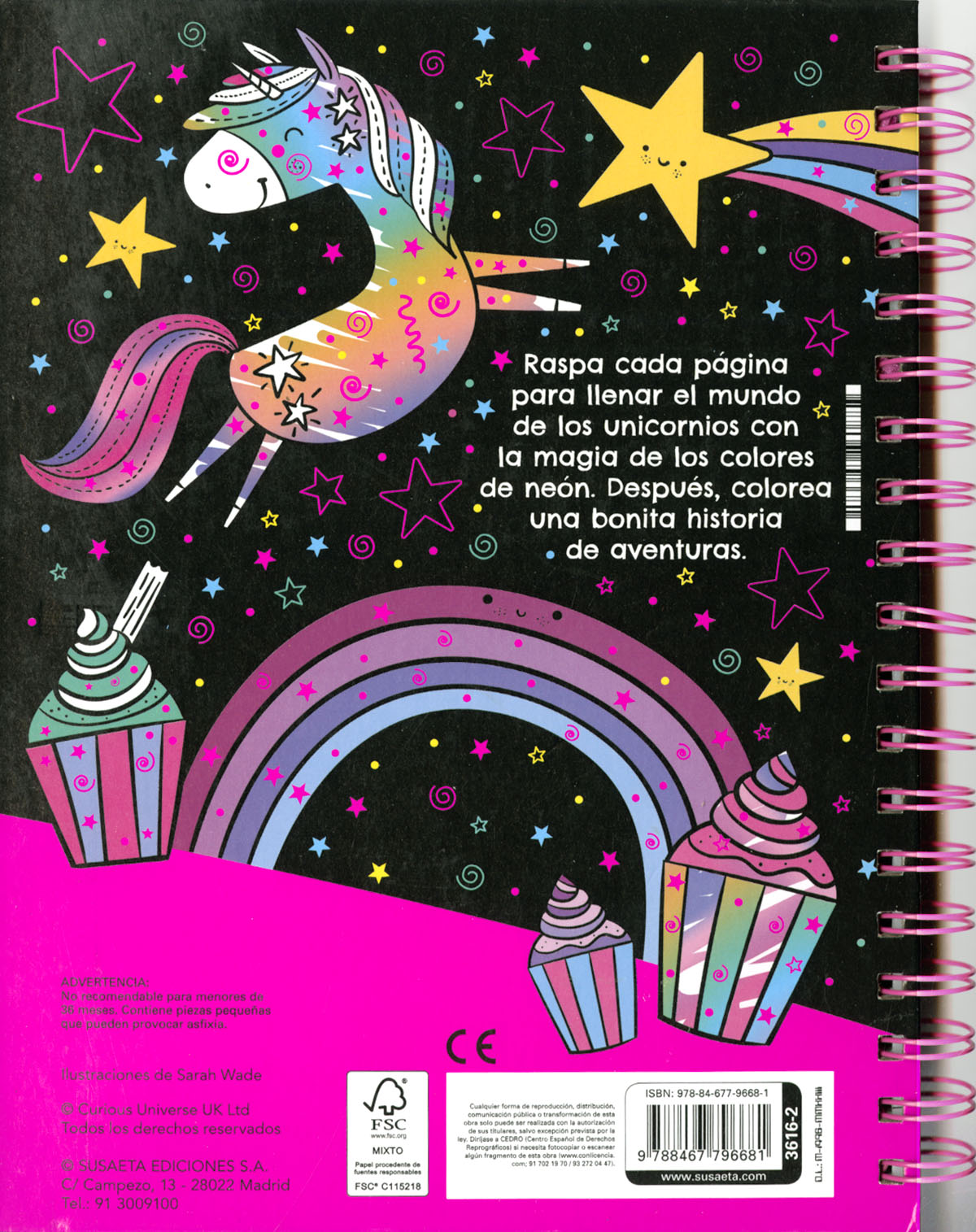 Encuadernación:  Cartón plastificado brillo con espiral,int. con punzón, láminas para raspar y colorear