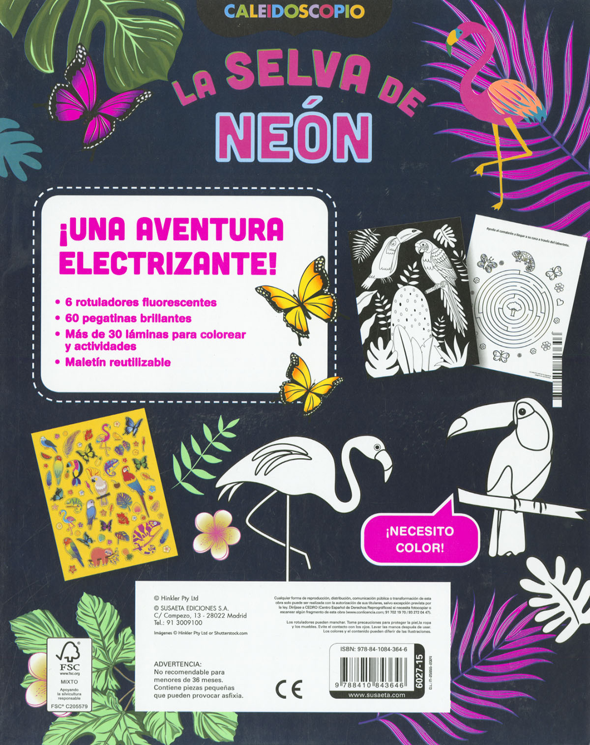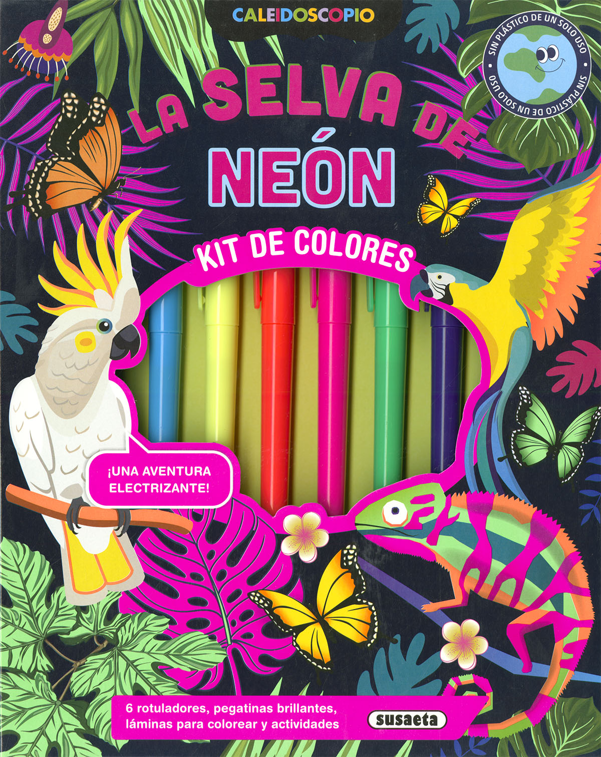 Con este kit de colores podrás crear una selva electrizante: incluye 6 rotuladores fluorescentes que podrás utilizar para colorear las láminas, y pegatinas de fondo de neón con animales de la selva para decorar tus carpetas y cuadernos. Usa los rotuladores y vuélvelos a guardar en su lugar: ¡así no los perderás!