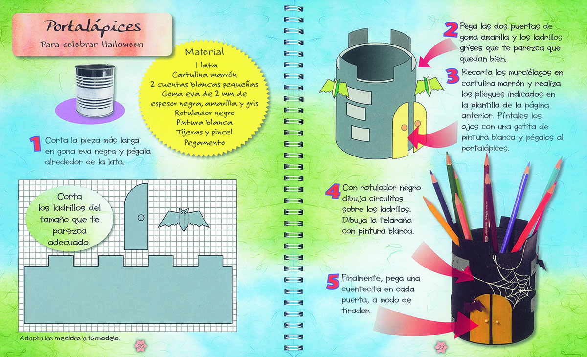 Encuadernación:  Cartoné plastificado mate con estampación, interior con espiral, plantillas, troquelados y pegatinas