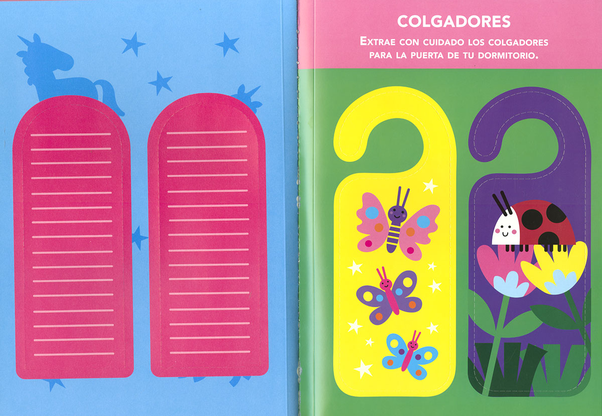 Encuadernación:  Cartulina plastificada brillo con estampación en color. Interior con pegatinas acolchadas