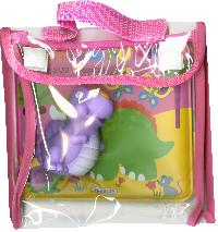 Encuadernación:  Bolsa de plástico con asa y cierre de velcro cont. libro de plástico acolchado y juguete con sonido