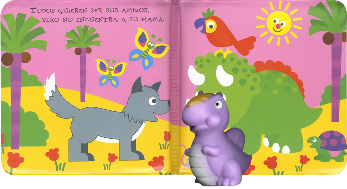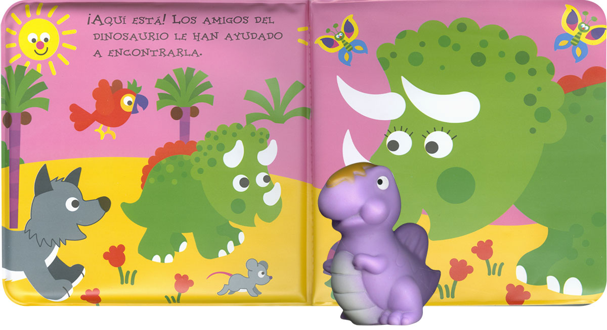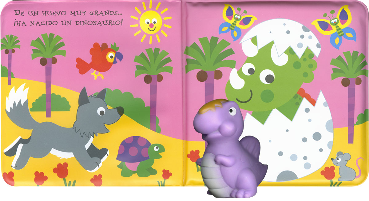 Un libro de plástico acolchado con ilustraciones a todo color de un simpático dinosaurio y sus amigos, y un muñeco de goma con sonido pensados para que los más pequeños de la casa disfruten siempre de la hora del baño.