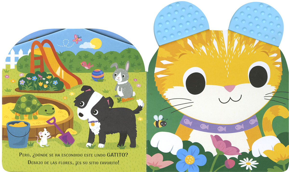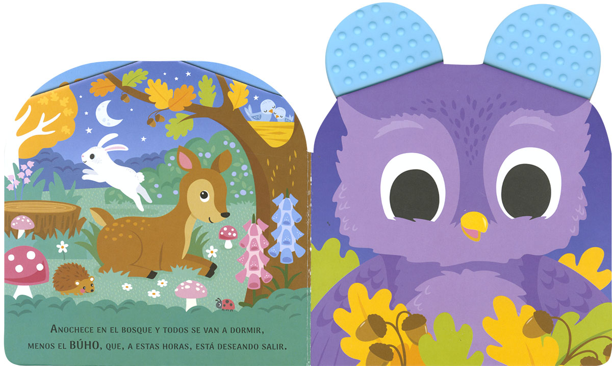 Este libro es ideal para los bebés. Un sencillo cuento, bonitas ilustraciones, forma troquelada y un mordedor de goma que hace las veces de orejas del animal, y con textura de puntos para que el niño pueda sentirlos al morder. ¡Un libro genial!