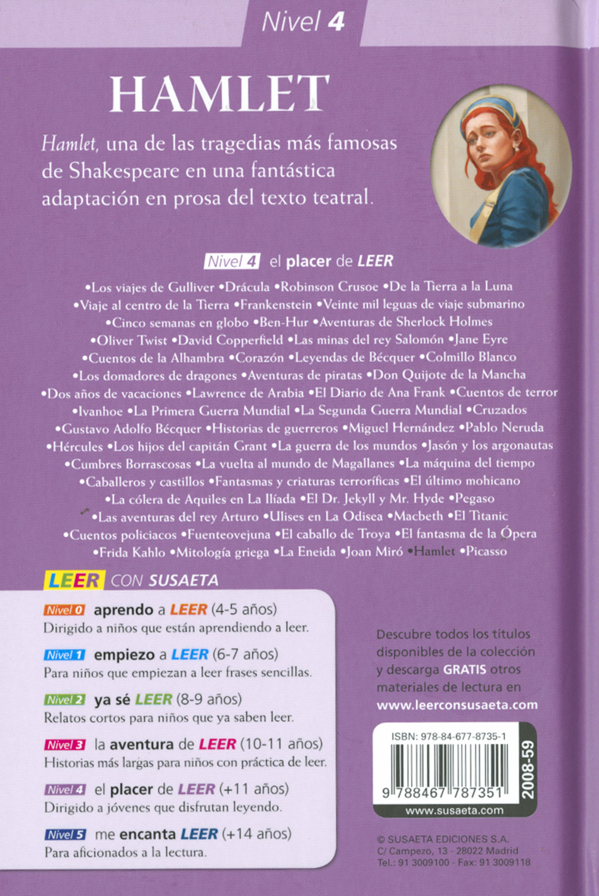 Hamlet, príncipe de Dinamarca, personaje lleno de dudas y contradicciones, trata de esclarecer las circunstancias que llevaron a la muerte de su padre. "Hamlet" es una de las tragedias más famosas de Shakespeare, cuyas obras nos siguen emocionando porque reflejan las luces y las sombras de la naturaleza humana. Una gran adaptación en prosa del texto teatral.