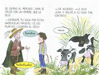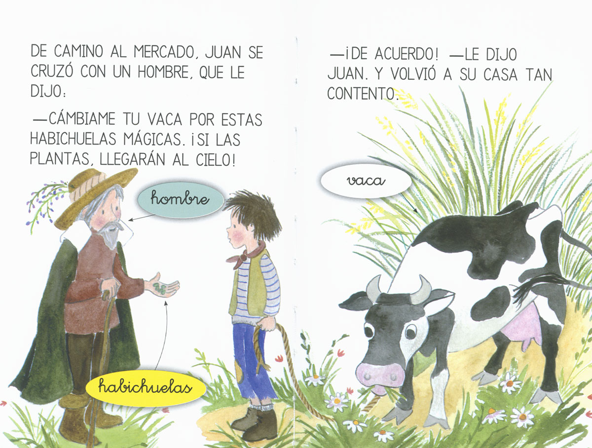 Juan y su madre son muy pobres; un día, su vieja vaca deja de dar leche y Juan tiene que ir almercado a venderla para sacar unas monedas por ella. Por el camino, se encuentra con un hombre que le ofrece cambiársela por unas habichuelas mágicas y a Juan le parece muy bien. ¿Qué crees que pasó después?