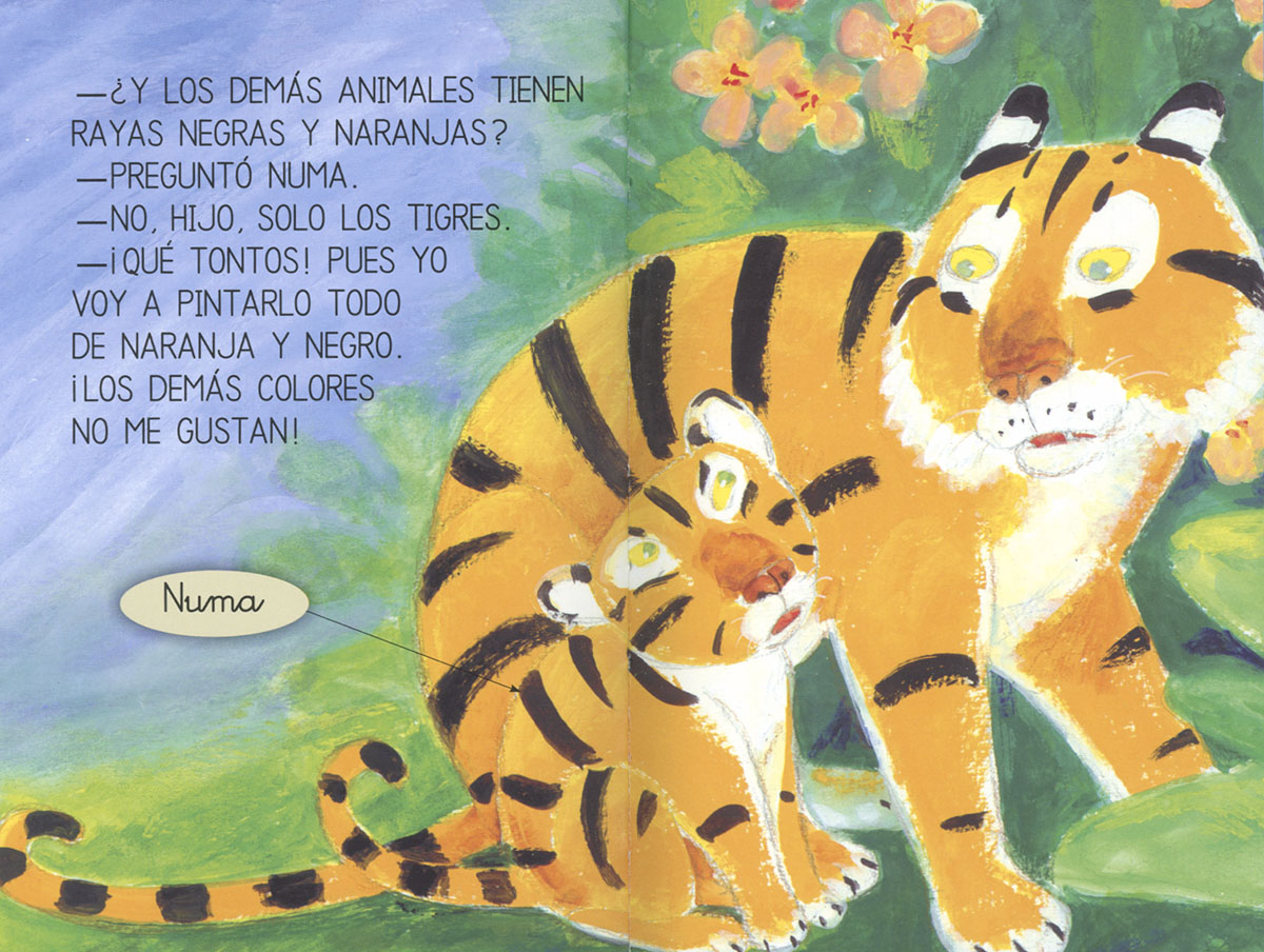 Numa, el pequeño cachorro de tigre, está convencido de que los colores más bonitos que hay en el mundo son el negro y el naranja, los que tiene su cuerpo, y decide pintarlo todo de esos colores: los árboles, las mariposas, los ciervos..., ¡incluso aunque no quieran! Hasta que un día descubre que estaba equivocado. Una tierna historia para los más pequeños que nos enseña que hay que ser más tolerantes.