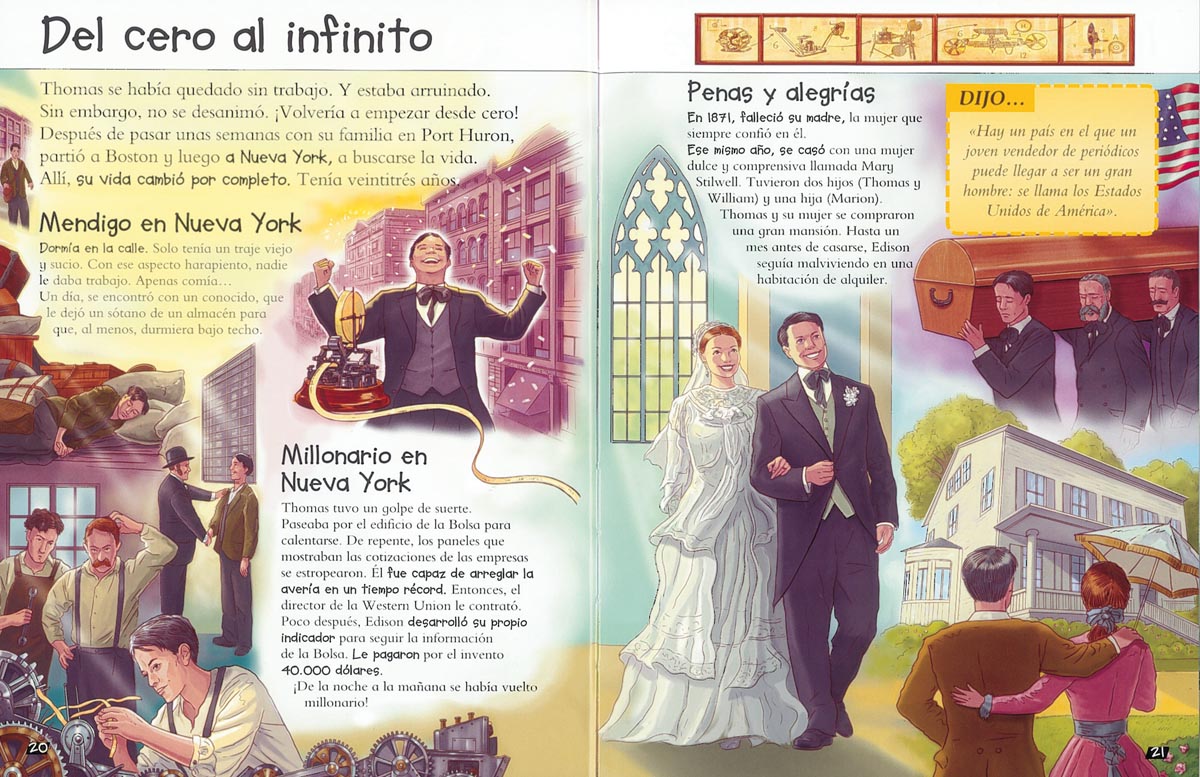 Thomas Edison representa el ideal del hombre americano que se hizo a sí mismo. Fue autodidacta. Desde niño sentía una enorme curiosidad por todo. Llegó a patentar más de mil inventos: aproximadamente, uno cada quince días. Entre los más importantes están el fonógrafo, el kinetoscopio y, sobre todo, la primera bombilla que irradiaba una luz duradera. Edison hizo la vida diaria más confortable a la humanidad entera. Este libro, lleno de datos, curiosidades, recuadros y preciosas ilustraciones, ofrece a los jóvenes lectores una forma entretenida y diferente de adentrarse en la biografía de uno de los grandes inventores del siglo XX.