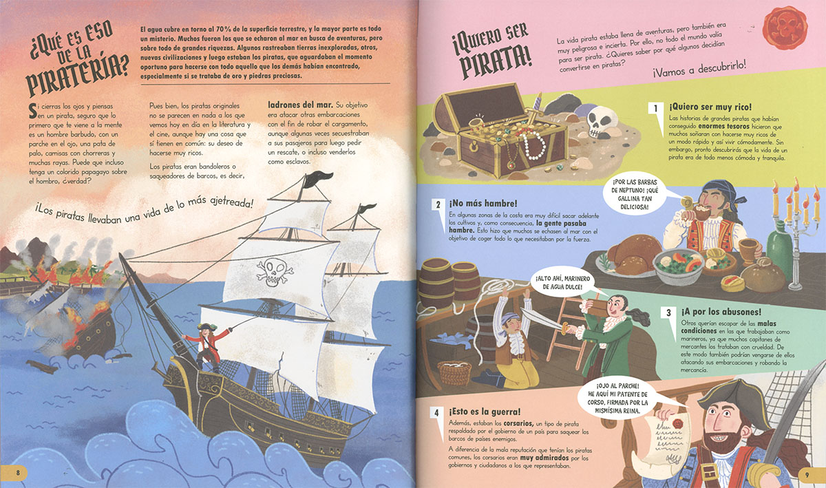 Alguna vez te has planteado convertirte en un auténtico pirata? Si es así, ¡este es tu libro! En él encontrarás todo lo que necesitas saber sobre su historia, la vida en el barco, los grandes tesoros, e incluso lo que comían mientras surcaban los mares en busca de nuevos botines. El libro, además, incluye un juego pirata y las instrucciones necesarias para hacer tu propio mapa del tesoro, una bandera, una espada... ¿Te atreves a adentrarte en el extraordinario mundo de los piratas?