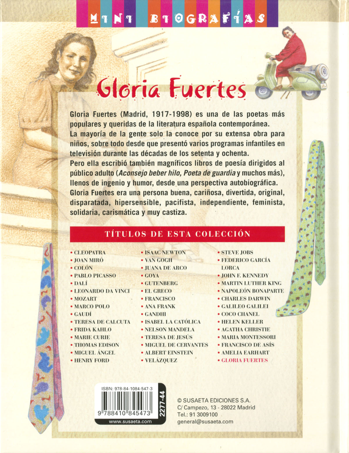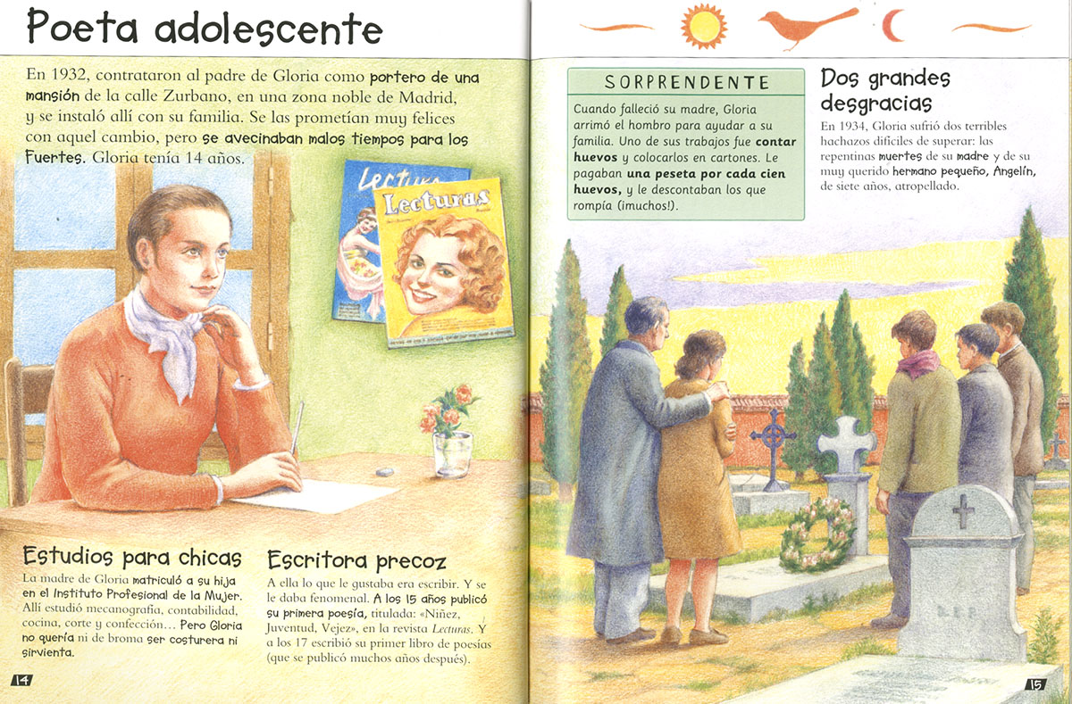 Gloria Fuertes es una de las poetas más populares y queridas de la literatura española contemporánea. La mayoría de la gente solo la conoce por su extensa obra para niños, pero ella escribió también magníficos libros de poesía dirigidos al público adulto, llenos de ingenio y humor, desde una perspectiva autobiográfica. Gloria Fuertes era una persona buena, cariñosa, divertida, original, disparatada, hipersensible, pacifista, independiente, feminista, solidaria, carismática y muy castiza. Con este fantástico libro, lleno de ilustraciones a todo color, podrás conocer a una de nuestras grandes poetas.