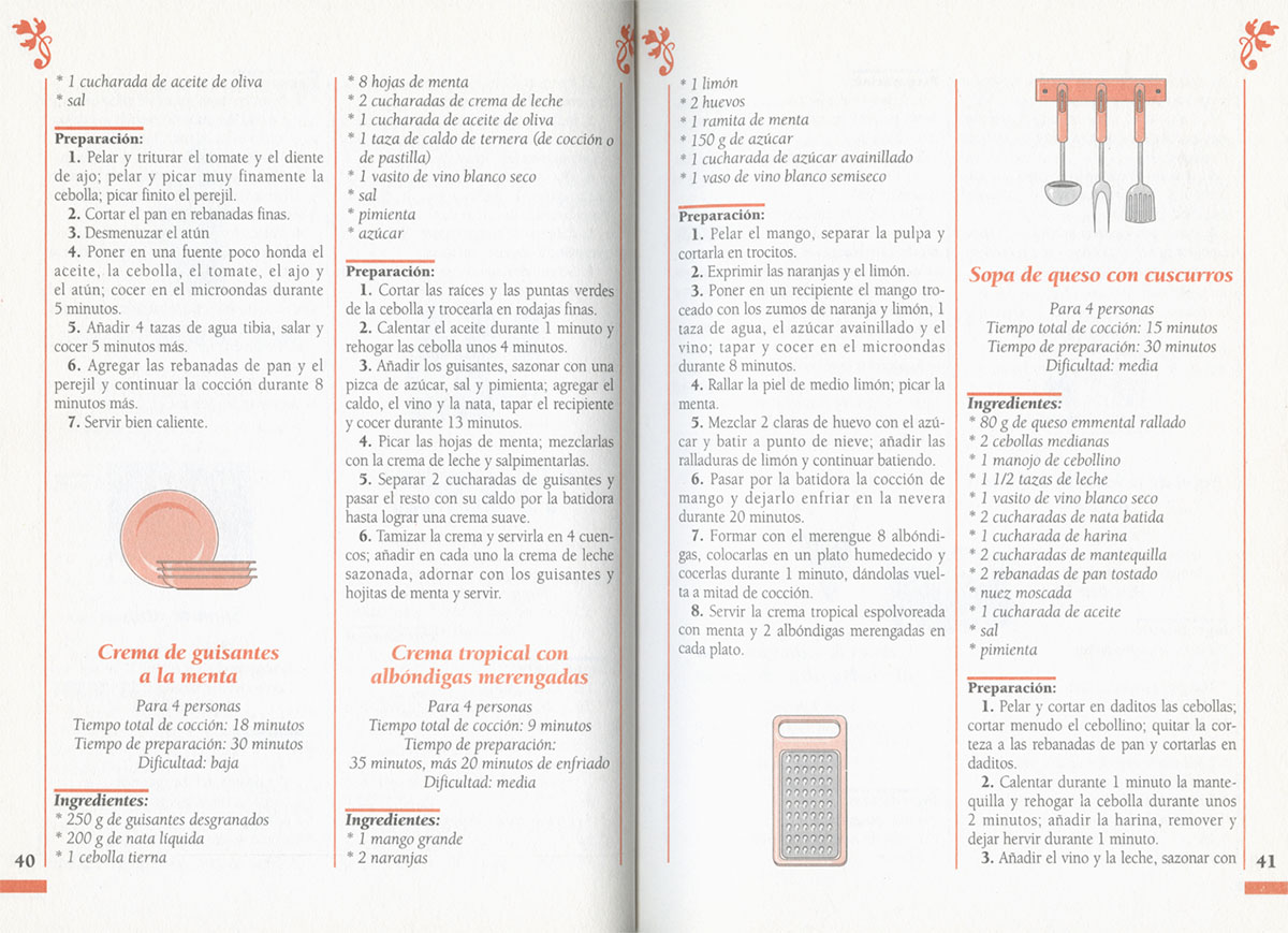 Una práctica selección de recetas de cocina para microondas que incluye entrantes, primeros platos, carnes, pescados, aves, postres e incluso helados, en uno de los primeros recetarios que aparecieron en el mercado cuando surgía la novedad del microondas y los lectores buscaban con avidez ideas y consejos para utilizarlos en sus hogares.