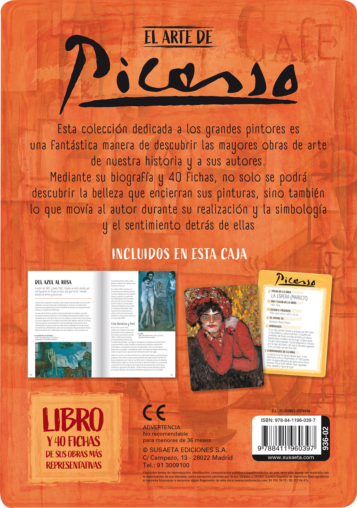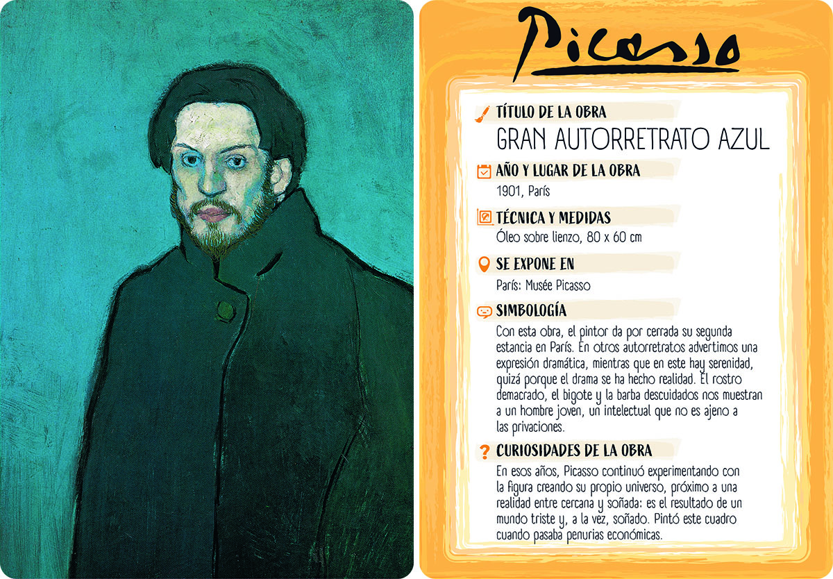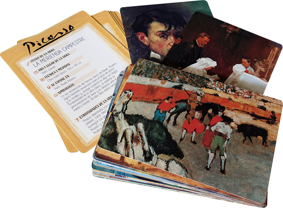 Pablo Picasso fue posiblemente el artista más importante del siglo xx. Revolucionó la pintura y abrió nuevos caminos expresivos. Pero además destacó como escultor, ilustrador de libros, ceramista y grabador; incluso escribió una obra de teatro y un libro de poesía. Pocas personas de su tiempo gozaron de tanta popularidad. Su vida resulta apasionante y su asombrosa obra ha quedado para siempre. Esta caja incluye un libro en el que muestra su vida y obra, así como 40 fichas comentadas con otras tantas de sus más representativas obras.