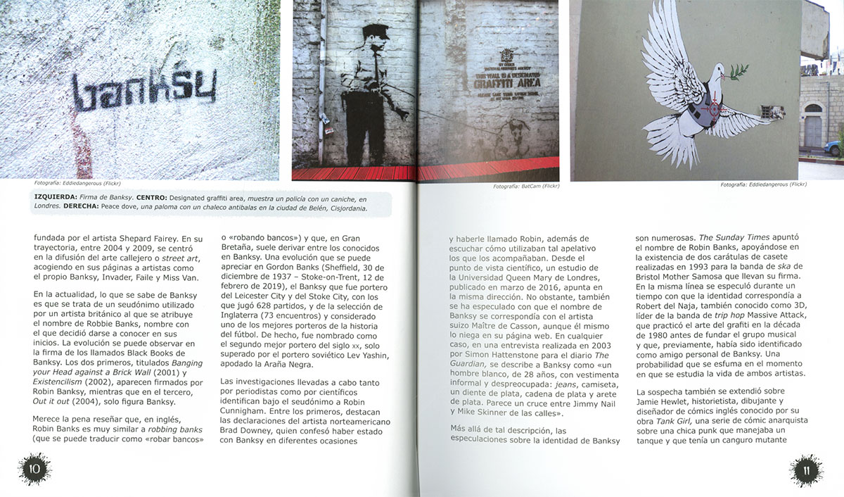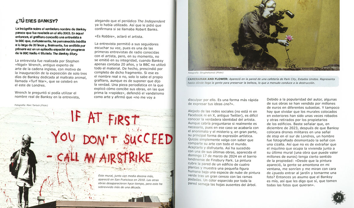 En este libro analizamos y acercamos al lector la obra dispersa por todo el mundo del enigmático artista británico que convierte el entorno urbano en su lienzo, revolucionando el mundo del arte con su estilo único y provocador. Conjuga con maestría el estarcido y el grafiti tradicional para crear imágenes cargadas de mensajes políticos y sociales, cargadas de ironía y humor negro, siempre a favor de los más débiles. Su obra invita a la reflexión y al desafío de las convenciones. El anonimato potencia su aura de misterio, contribuyendo a que sus transgresores mensajes resuenen en todo el mundo.