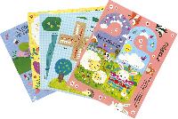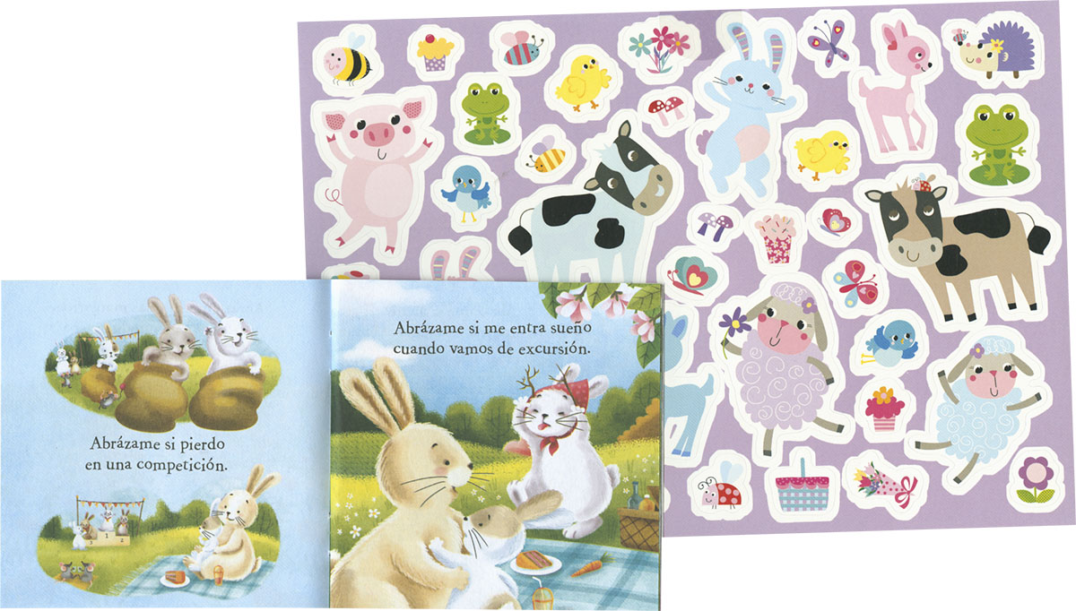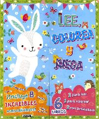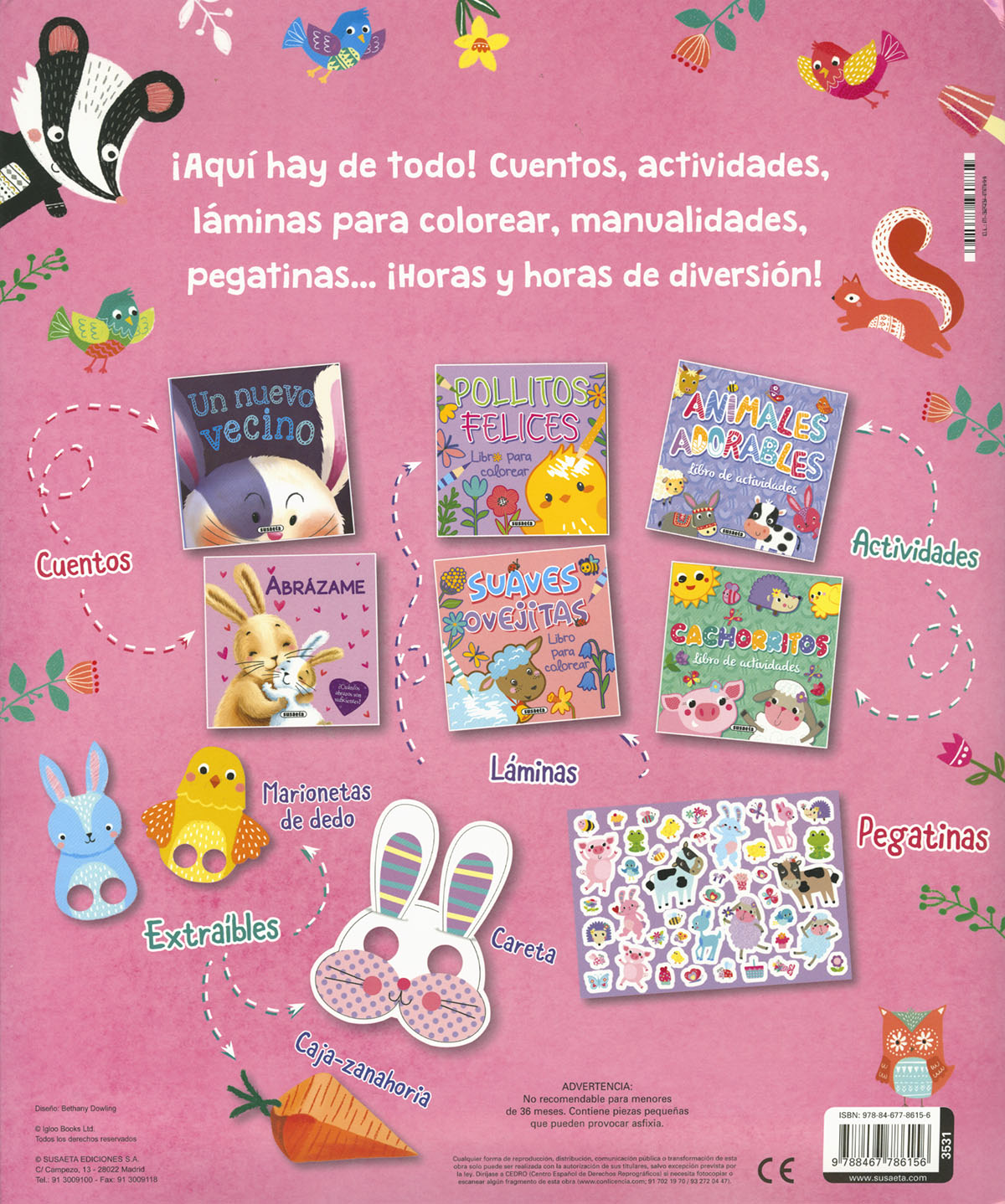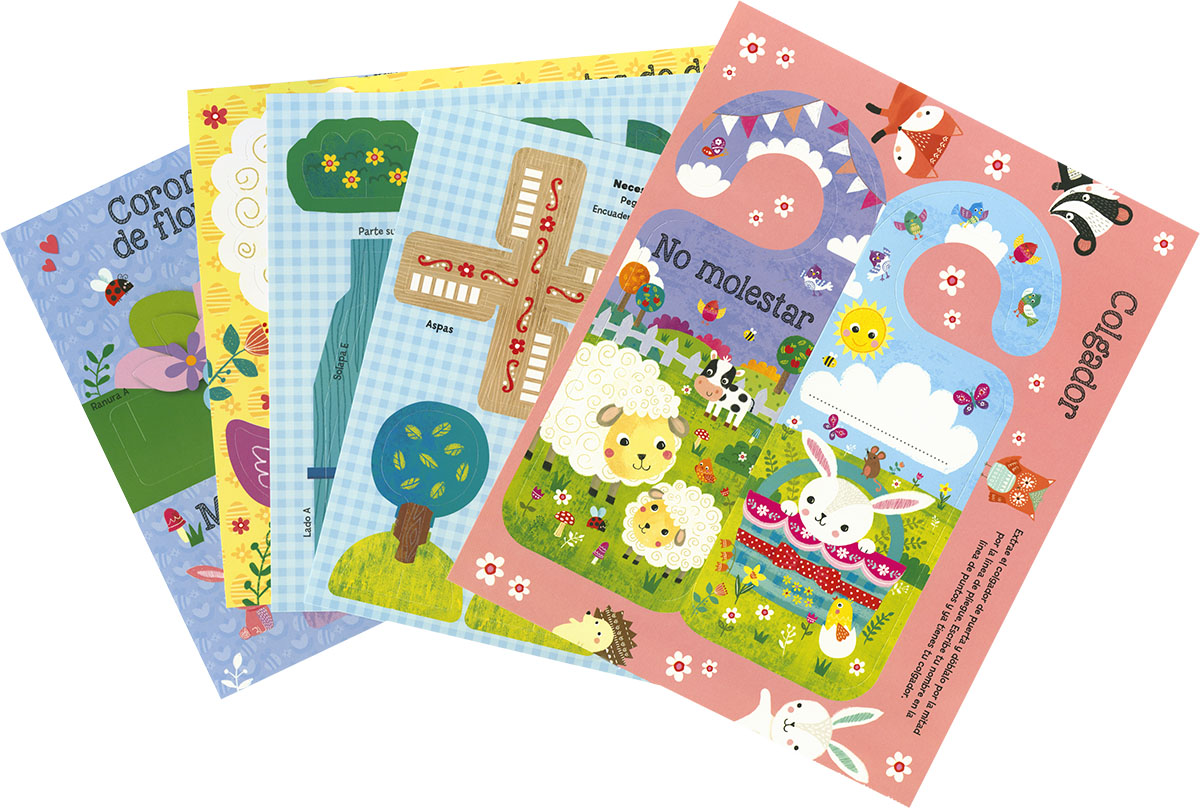 Encuadernación:  Cartulina plastificada cierre con velcro, contiene pegatinas, 6 libros y 8 manualidades
