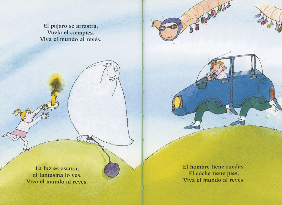 El ratón persigue al gato, el gato asusta al perro, el perro habla, el hombre ladra..., esto es parte del mundo al revés, pero también está el mundo al derecho: "Los niños en la escuela y los patos a volar, ¡cua, cua, cua!". Entra en el mundo de Gloria Fuertes y disfruta de sus versos tiernos y divertidos.