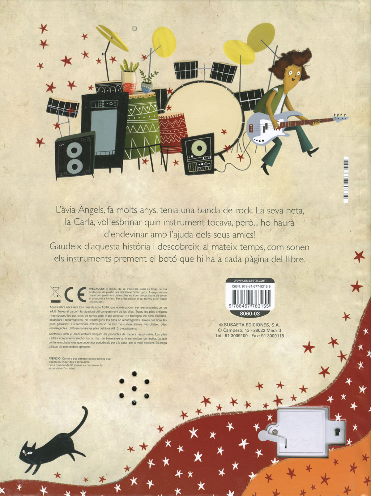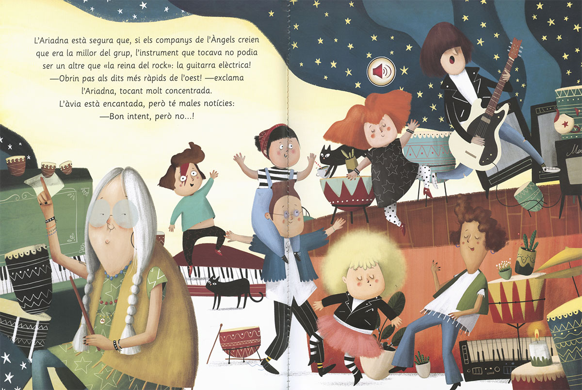 L'àvia Àngels, fa molts anys, tenia una banda de rock. La seva neta, la Carla, vol esbrinar quin instrument tocava, però... ho haurà d'endevinar amb l'ajuda dels seus amics! Gaudeix d'aquesta història i descobreix, al mateix temps, com sonen els instruments prement el botó que hi ha a cada pàgina del llibre.