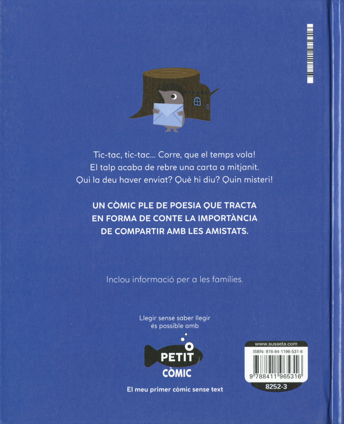 Llegir només sense saber llegir és possible! El teu primer còmic sense text és a la col·lecció Petit Còmic. Tic-tac, tic-tac... Corre, que el temps apressa! El talp acaba de rebre una carta al mig de la nit. Qui l'haurà enviat? I què diu? Quin misteri! Un còmic ple de poesia que aborda en forma de conte la importància de compartir en amistat.