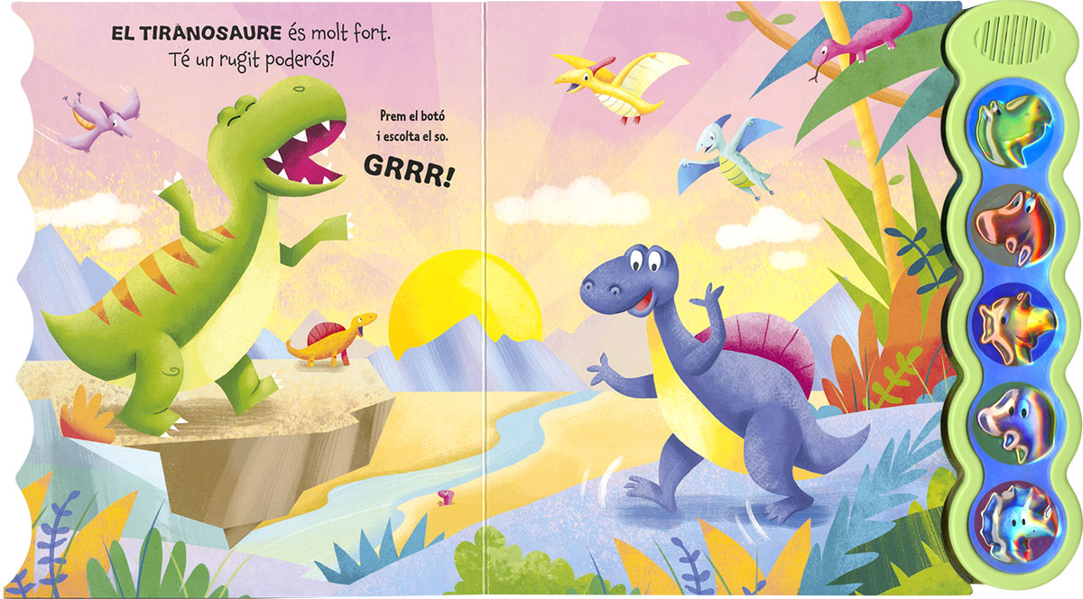 Es tracta d'un atractiu llibre infantil de sons que fascinar脿 als nens. Cont茅 divertides il路lustracions que atraparan la seva atenci贸, i no es cansaran de pr茅mer els botons una vegada i una altra per a sentir els dinosaures. Una diversi贸 assegurada!