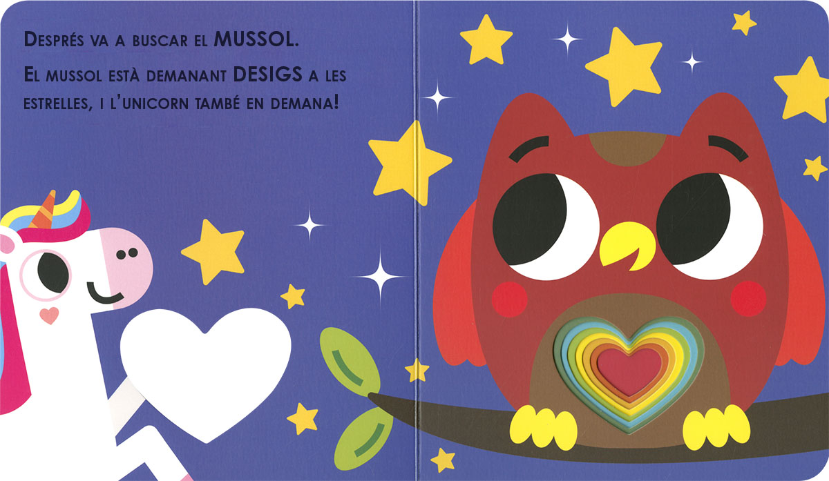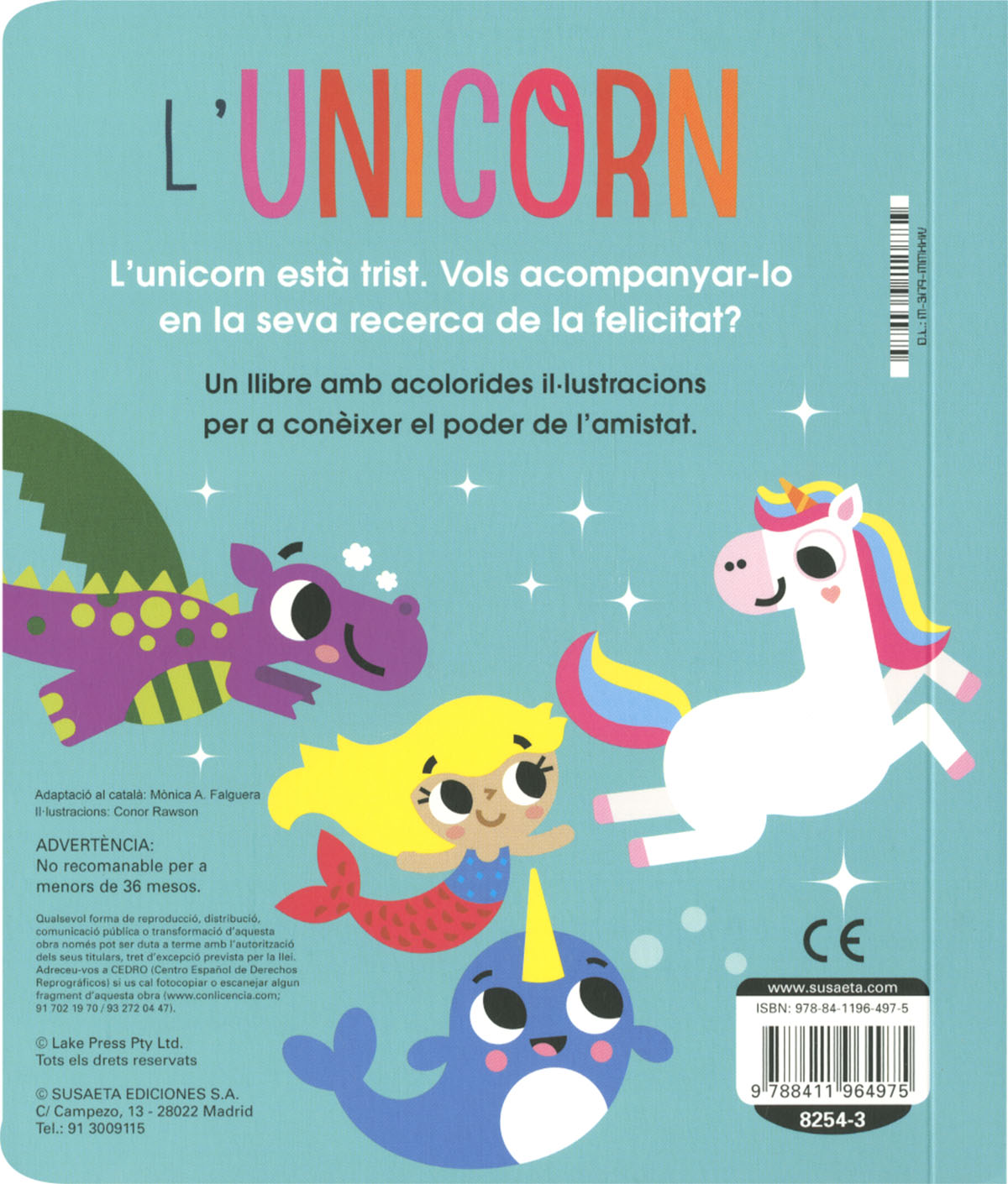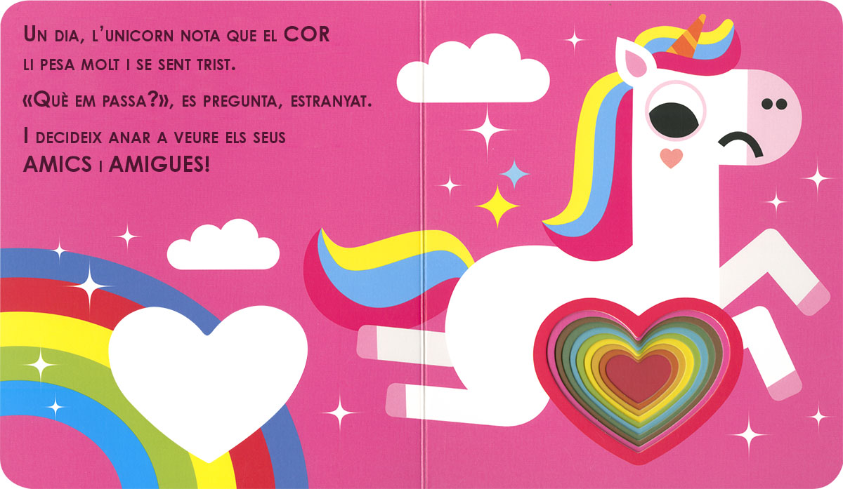 L?unicorn està trist. Vols acompanyar-lo en la seva recerca de la felicitat? Pots fer-ho amb aquest llibre de cartró de pàgines encunyades i acolorides il·lustracions, ideal per als més petits i petites de la casa.