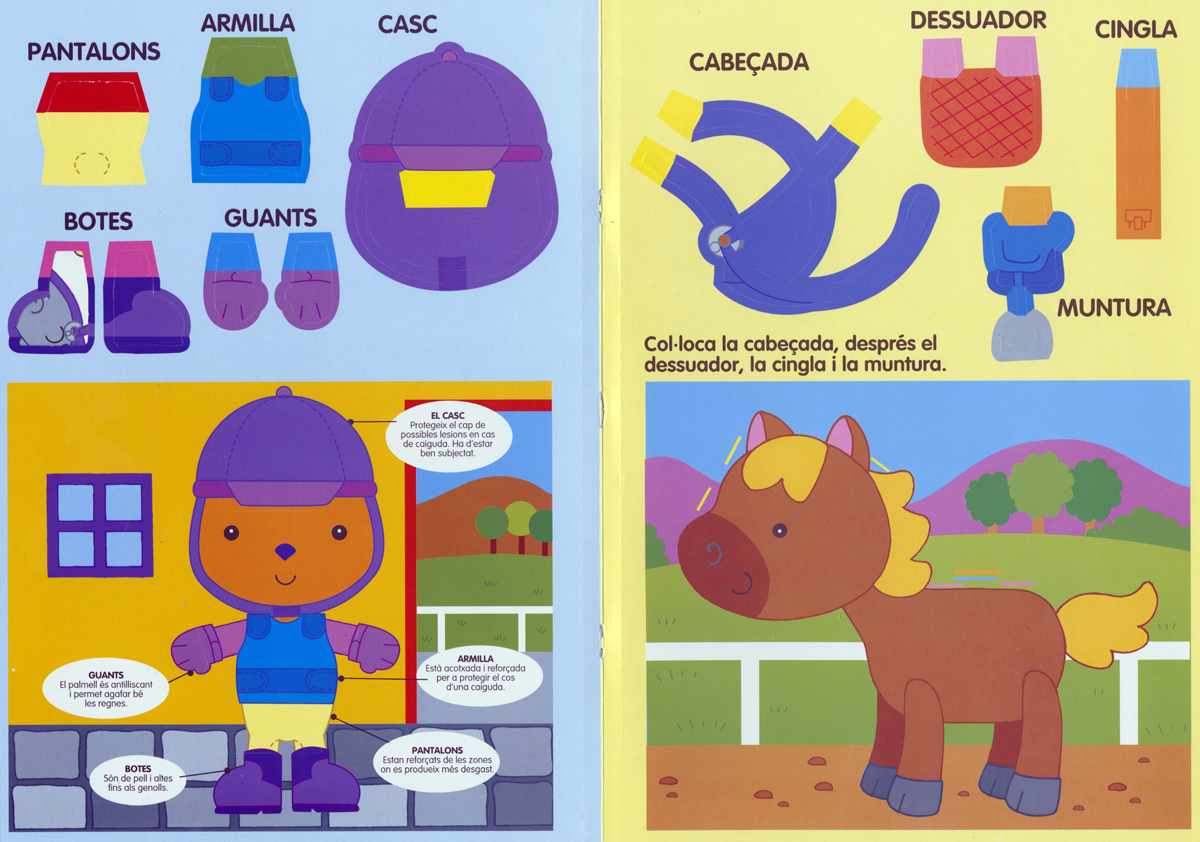 Un gran llibre amb figures extraïbles i un escenari per a muntar i jugar. Aprèn com tenir cura del teu cavall i coneix tots els accessoris que et calen. Vesteix el genet i el seu cavall com més t'agradi.