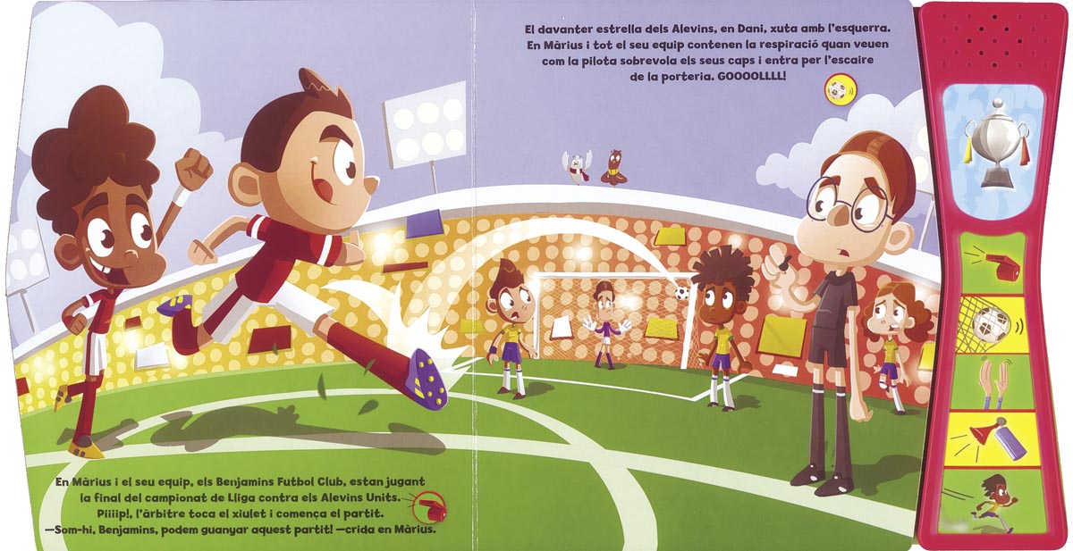 Piiiip !! L´últim partit del campionat de Lliga acaba de començar. En Màrius i el seu equip, els Benjamins Futbol Club, volen guanyar, però... Qui s´endurà finalment el trofeu? Si t´agrada el futbol has de llegir aquesta història, que té, a més a més, sis fantàstics sons tan reals com si fossis al terreny de joc.