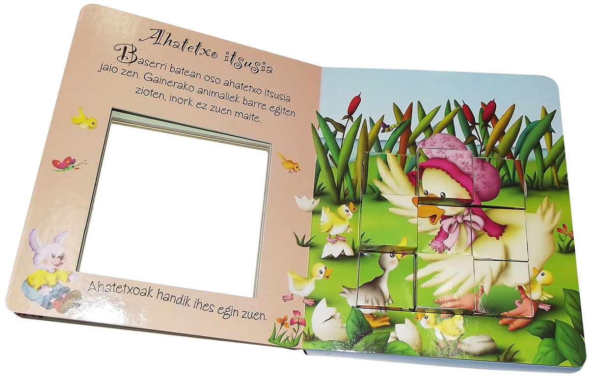 Enquadernació:  Caixa amb llibre de fulles de cartró plastificat i encunyat amb purpurina i puzle de galledes