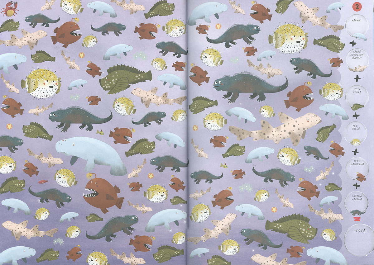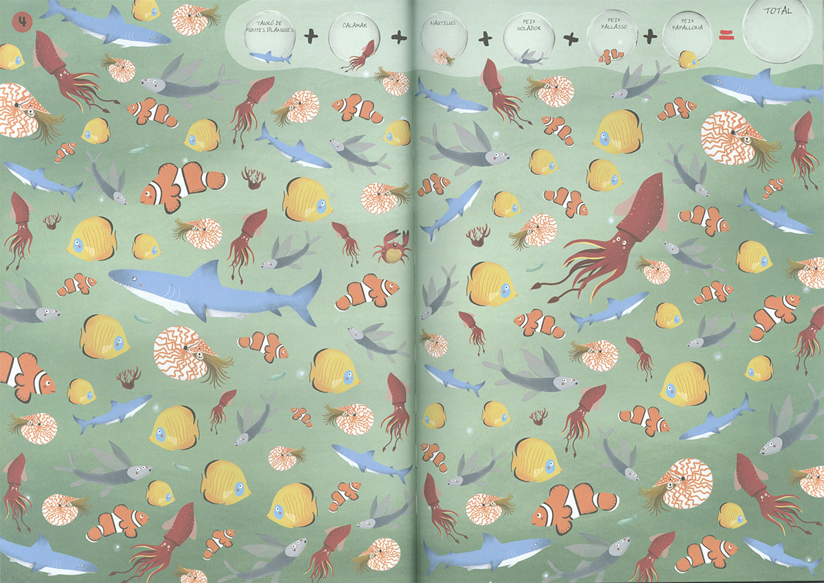 Benvinguts a aquesta aventura en el món marí. Us han transportat a les profunditats de l'oceà, on trobareu un munt d'animals sorprenents. A partir d'ara, haureu d'explorar les pàgines d'aquest llibre per a BUSCAR, DESCOBRIR i COMPTAR tots els animals marins que hi ha. A continuació, la vostra tasca serà sumar-los tots i anotar els resultats. Però... atenció! Si us equivoqueu haureu de tornar a començar. Endavant, divertiu-vos molt!