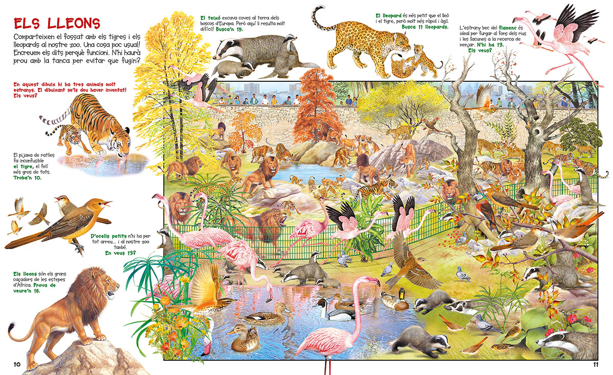 Un títol més d'aquesta col·lecció per a aprendre i gaudir buscant els nombrosos animals, persones i objectes de tot tipus que s'amaguen a les sorprenents il·lustracions. Aquesta vegada aprendràs un munt de curiositats sobre els animals del zoo... Tot un desafiament!