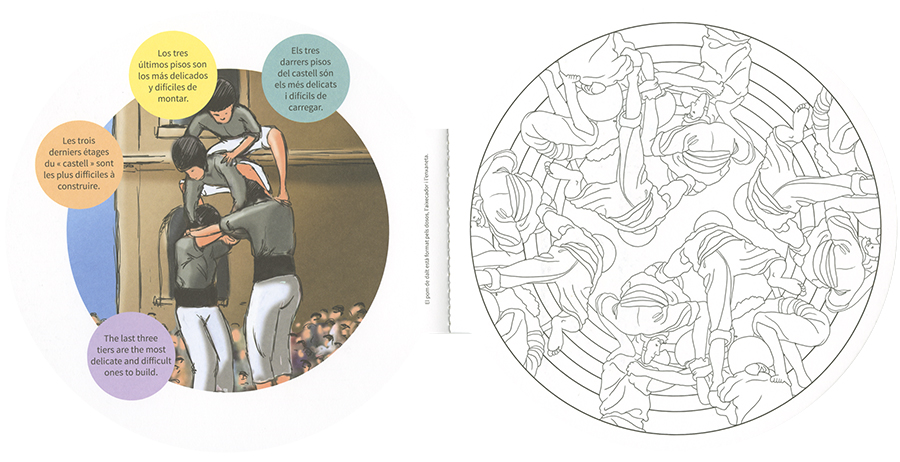 Aquest llibre té mandales, i altres originals dissenys, perquè els pintis com vulguis i et relaxis fent-ho. Escull quin color prefereixes, i aprofita per a descobrir tots els secrets sobre com es construeixen els castells i sobre qui són els castellers que hi trobaràs a l'interior en català, castellà, anglès i francès.