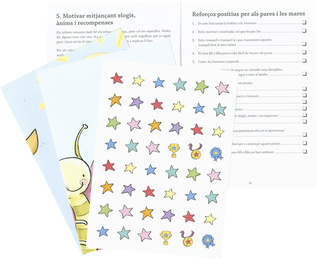 Enquadernació:  Llibre carpeta cartoné plastificat amb: guia per a pares, conte, làmines i adhesius de motivació